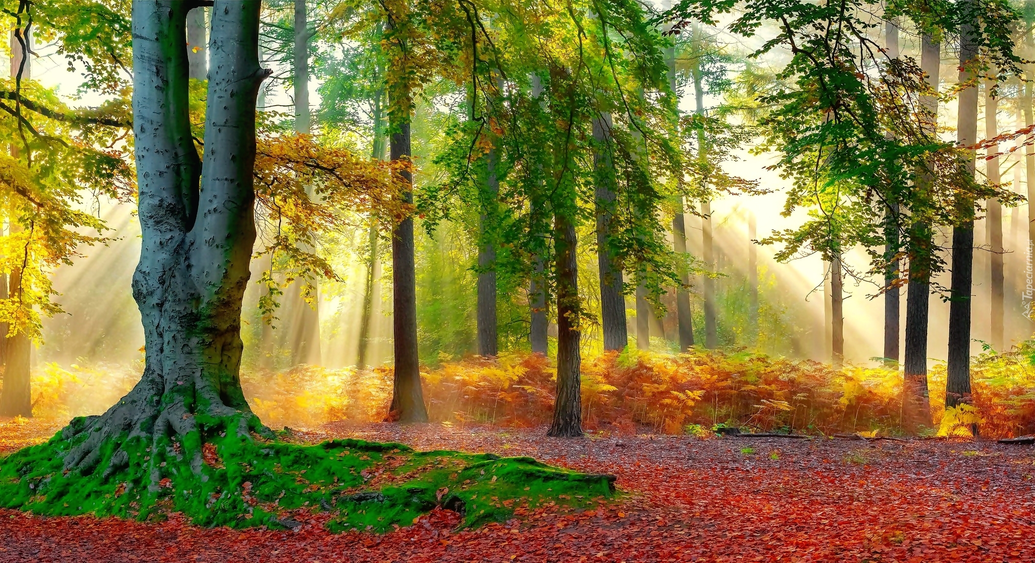 Edytor tapety: Las, Drzewa, Droga, Jesienne, Liscie, Promienie, Słońca