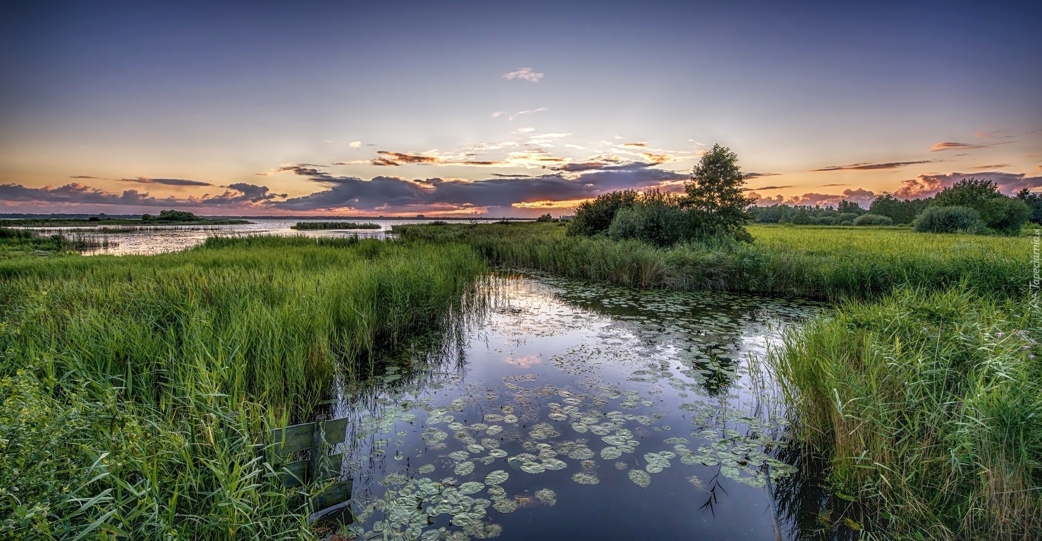 Edytor tapety: Jezioro, Trawa, Drzewa, Wschód, Słońca