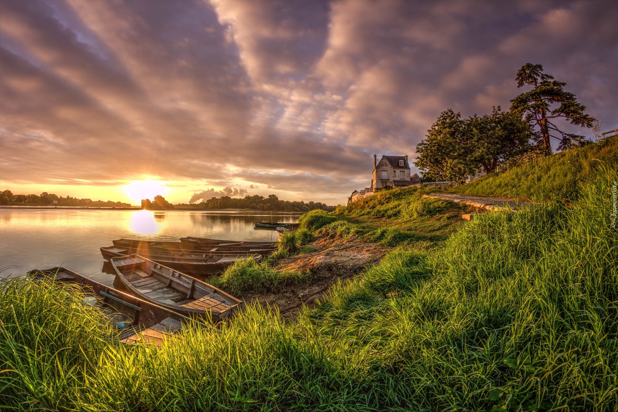 Edytor tapety: Łódki, Dom, Rzeka, Trawa, Chmury