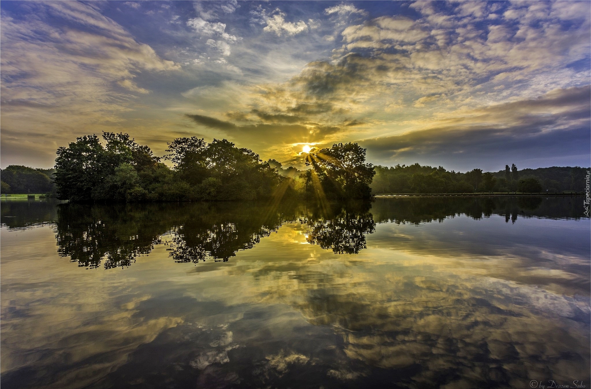 Edytor tapety: Rzeka, Drzewa, Promienie, Słońca, Odbicie