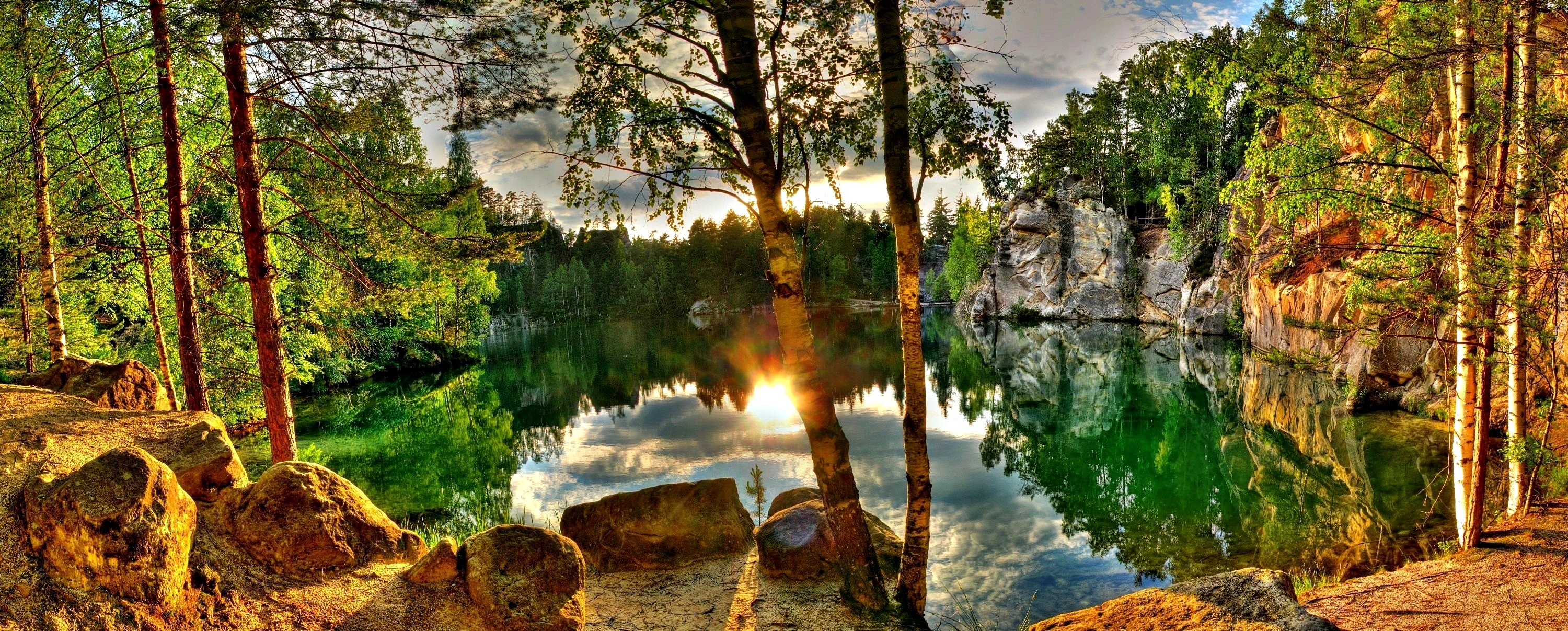 Edytor tapety: Jezioro, Las, Skały, Przebijające światło