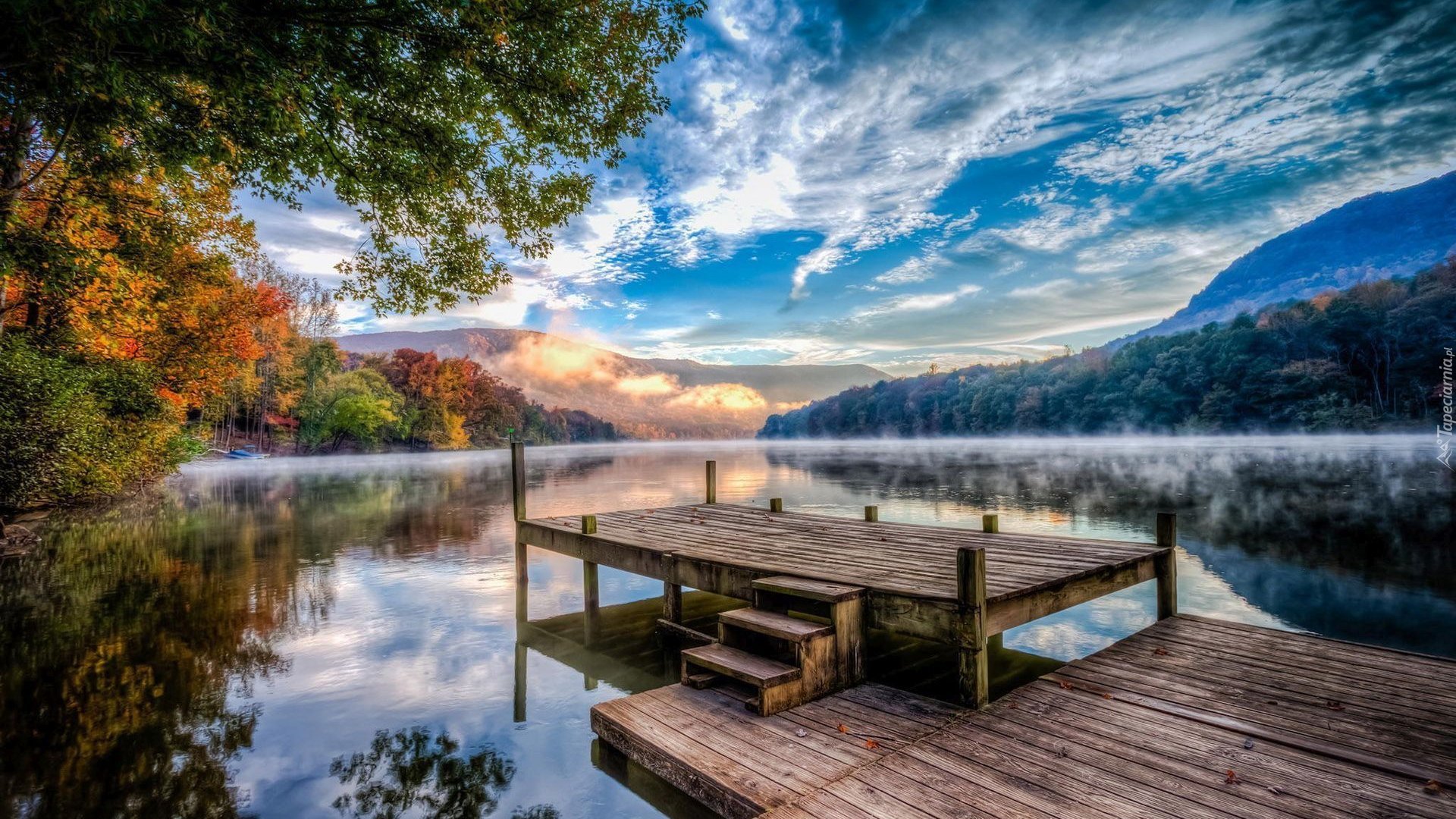Edytor tapety: Góry, Jezioro, Drewniany, Pomost