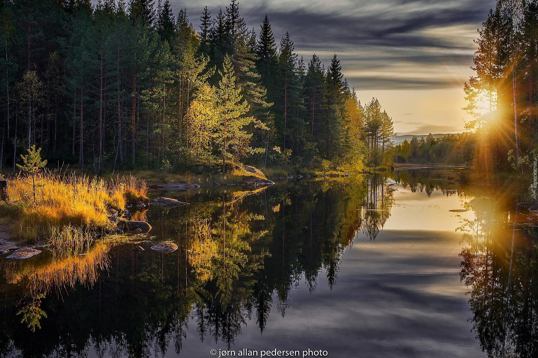 Edytor tapety: Las, Jesień, Wschód słońca, Rzeka, Odbicie