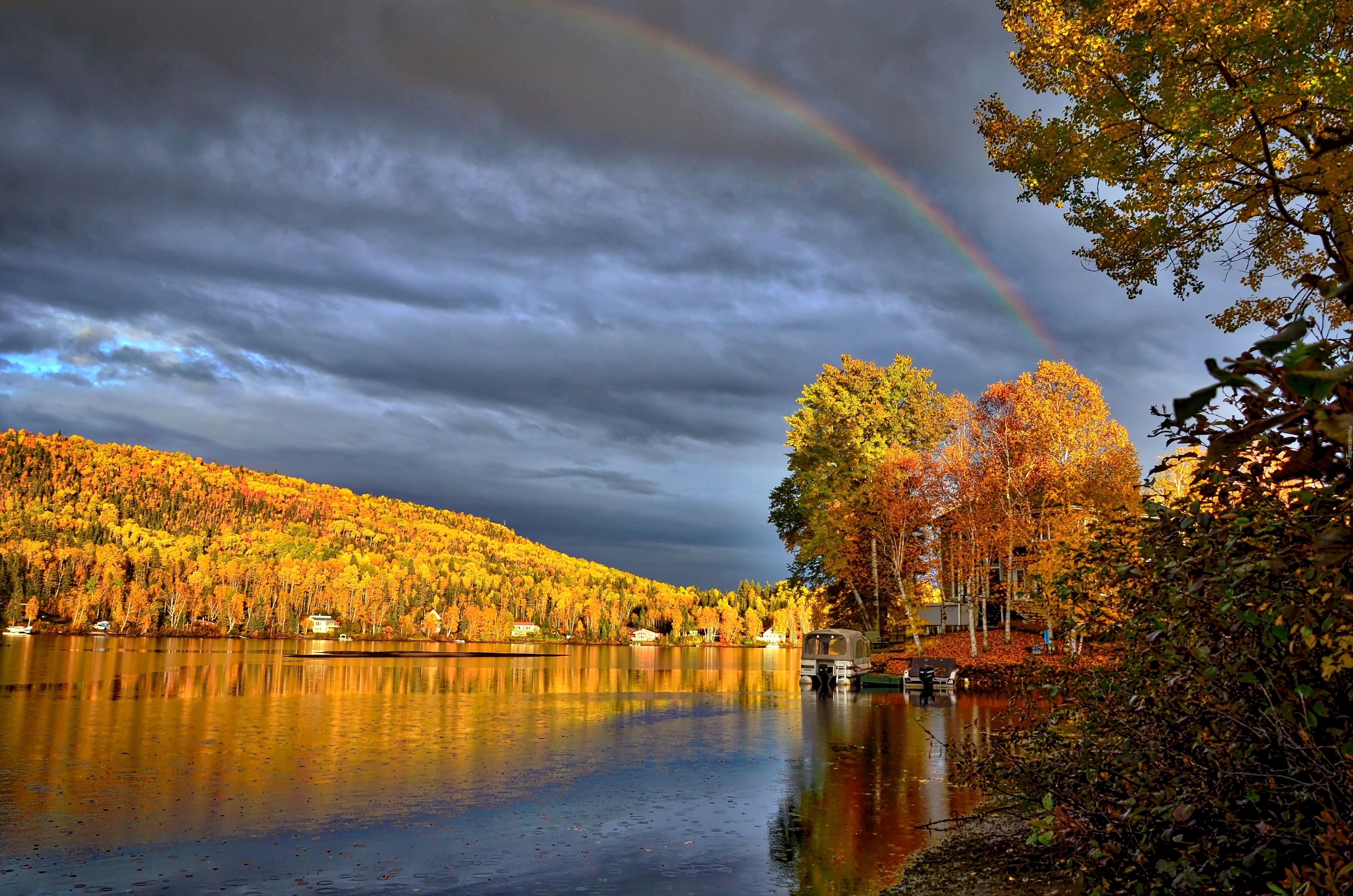 Edytor tapety: Jesień, Jezioro, Drzewa, Niebo, Chmury, Tęcza