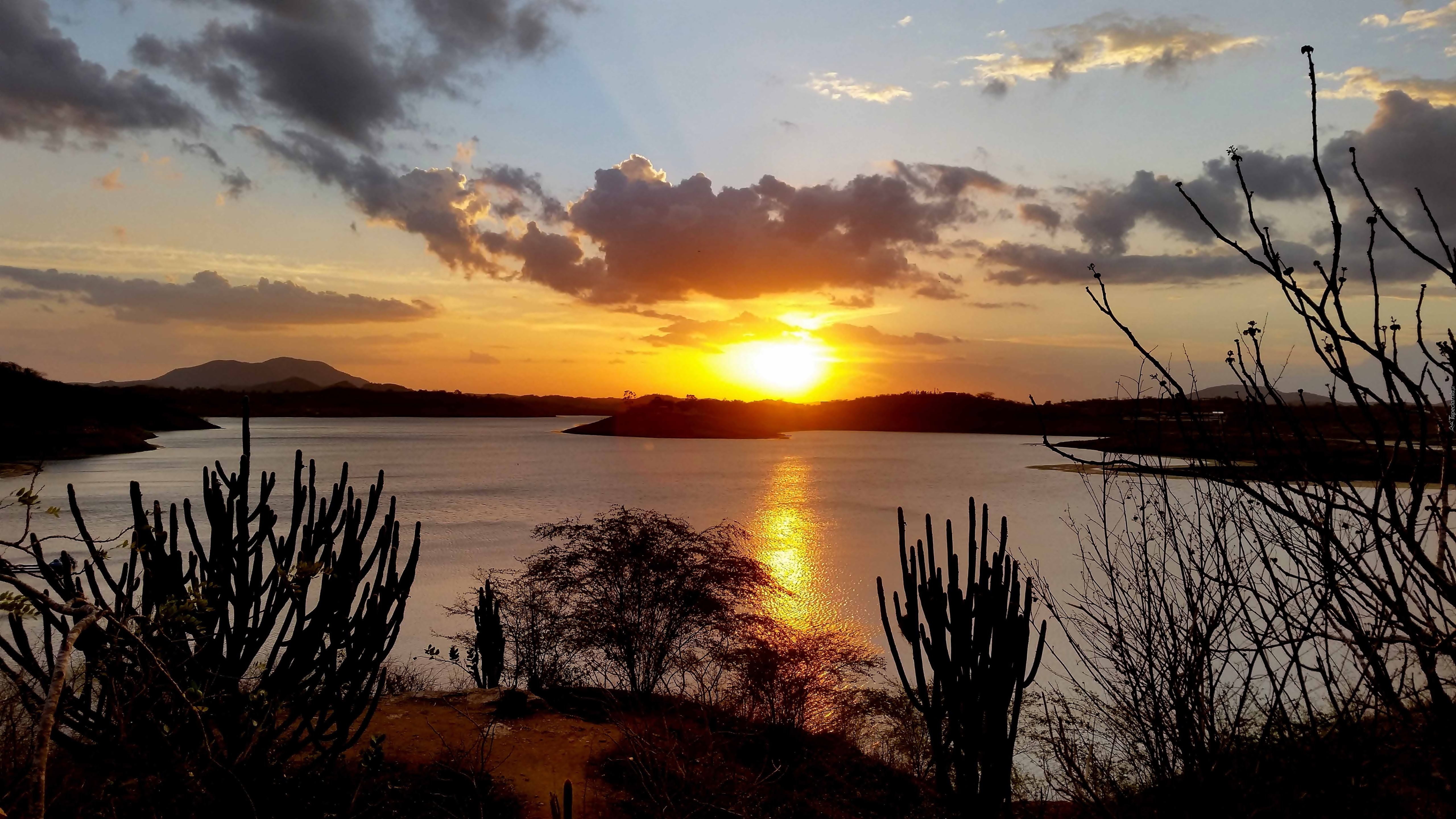 Edytor tapety: Jezioro, Góry, Zachód słońca, Roślinność, Chmury