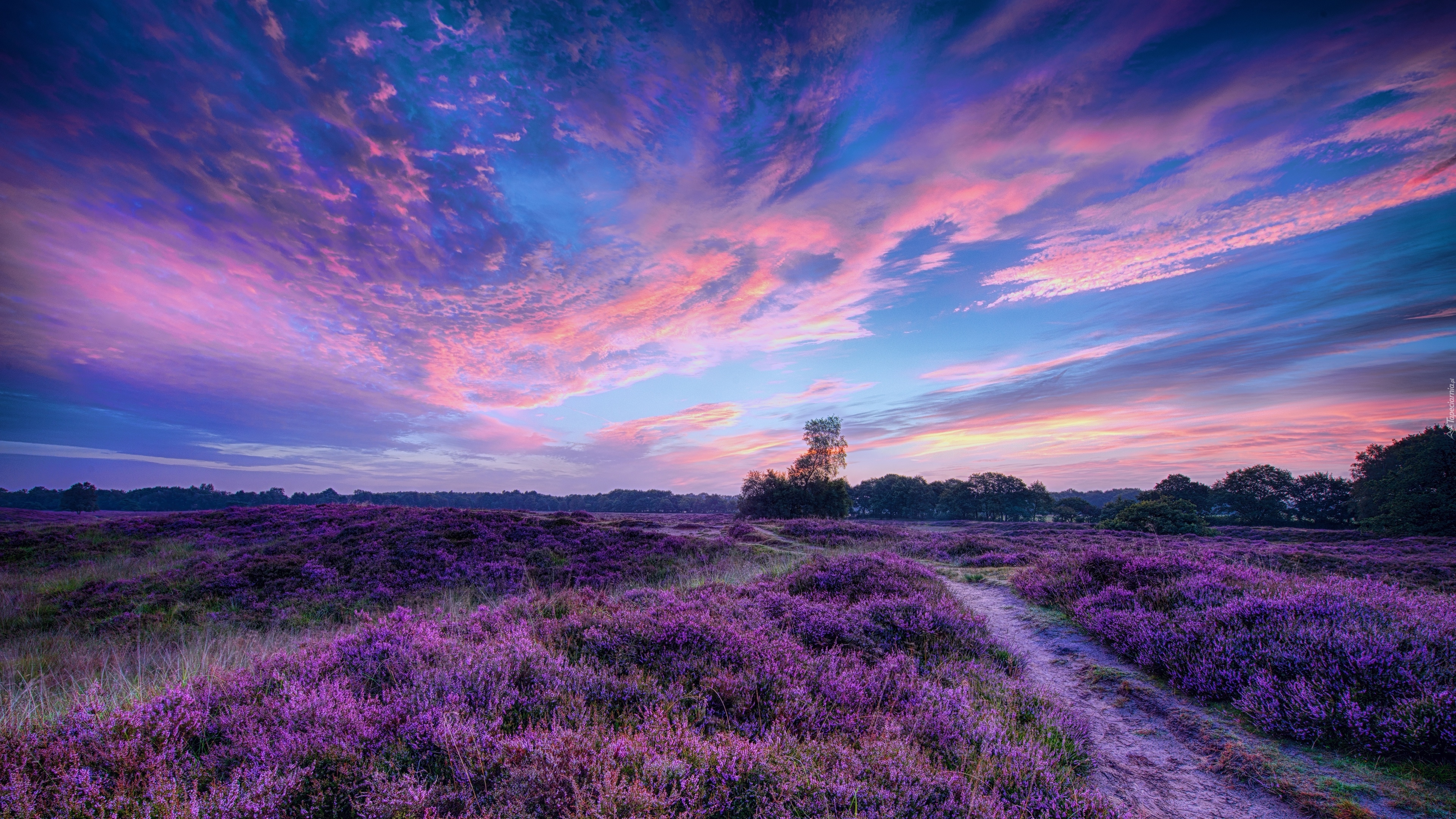 Edytor tapety: Pole, Ścieżka, Wrzosy, Lasy, Drzewa, Piękny, Zachód, Słońca