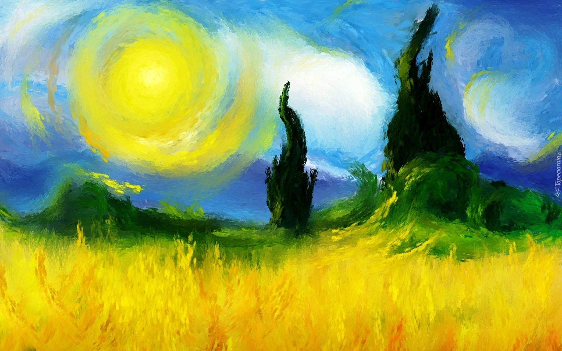 Edytor tapety: Malarstwo, Obraz, Słońce, Pole, Drzewa