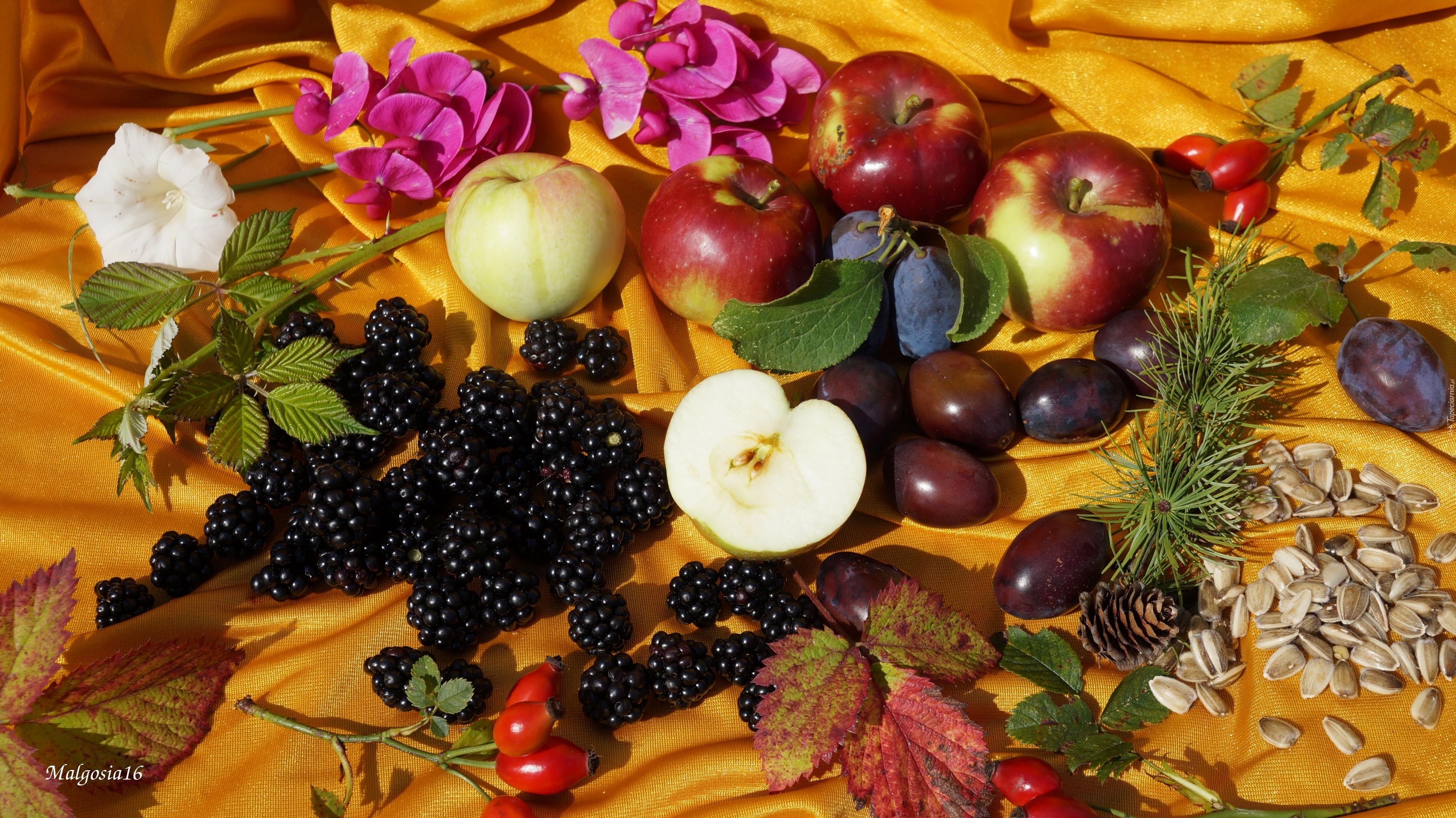 Edytor tapety: Kompozycja, Owoce, Jabłka, Jeżyny, Śliwki, Ziarna Słonecznika