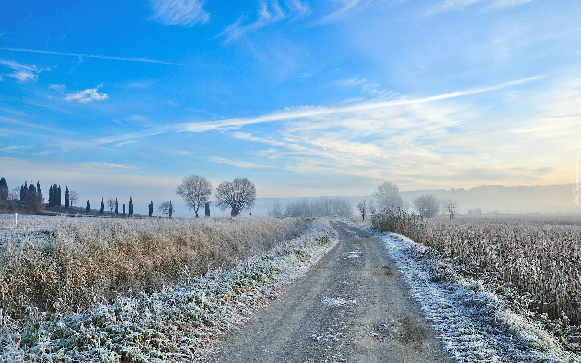 Edytor tapety: Droga, Pola, Szron, Mgła, Drzewa