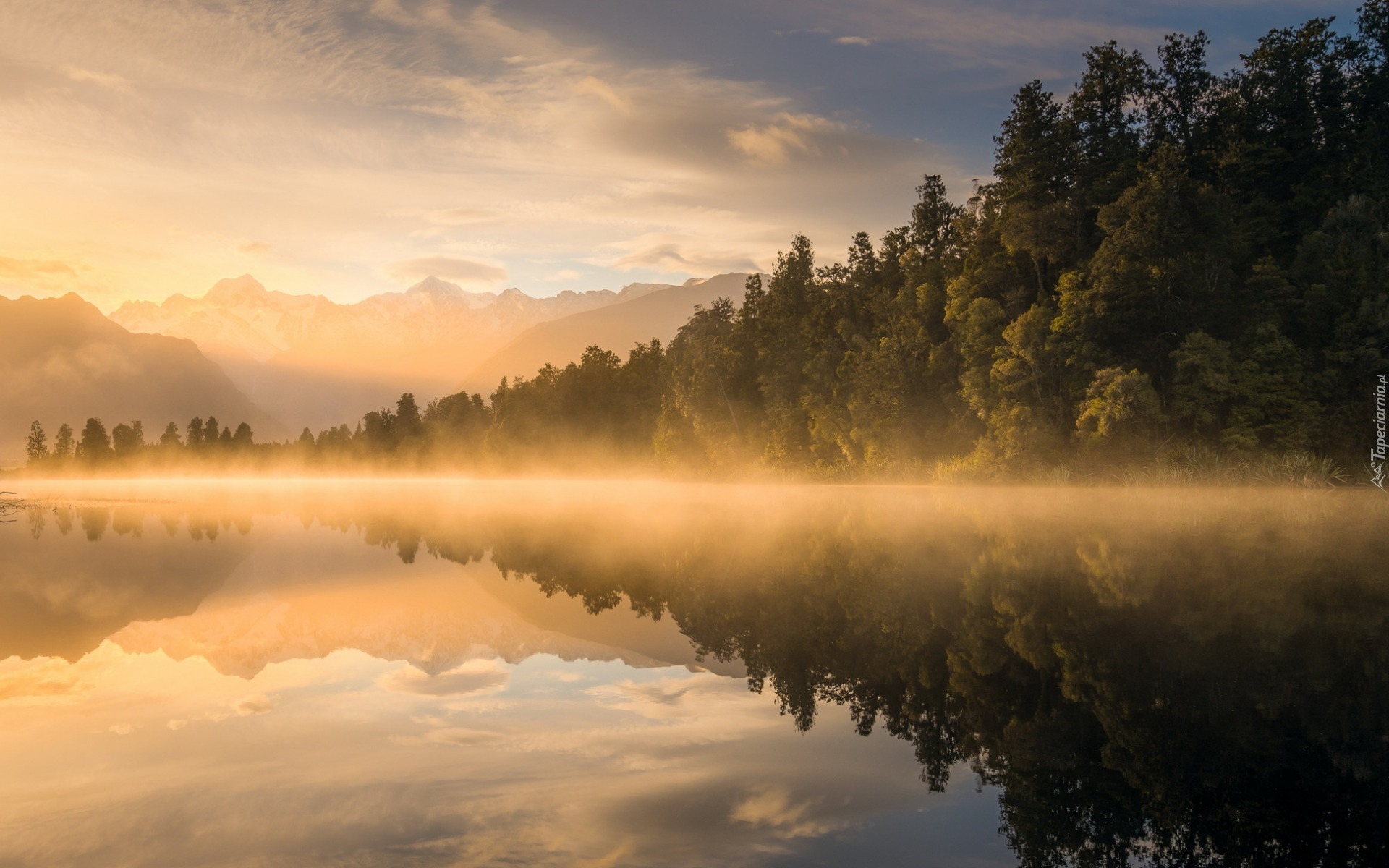 Edytor tapety: Las, Drzewa, Mgła, Jezioro
