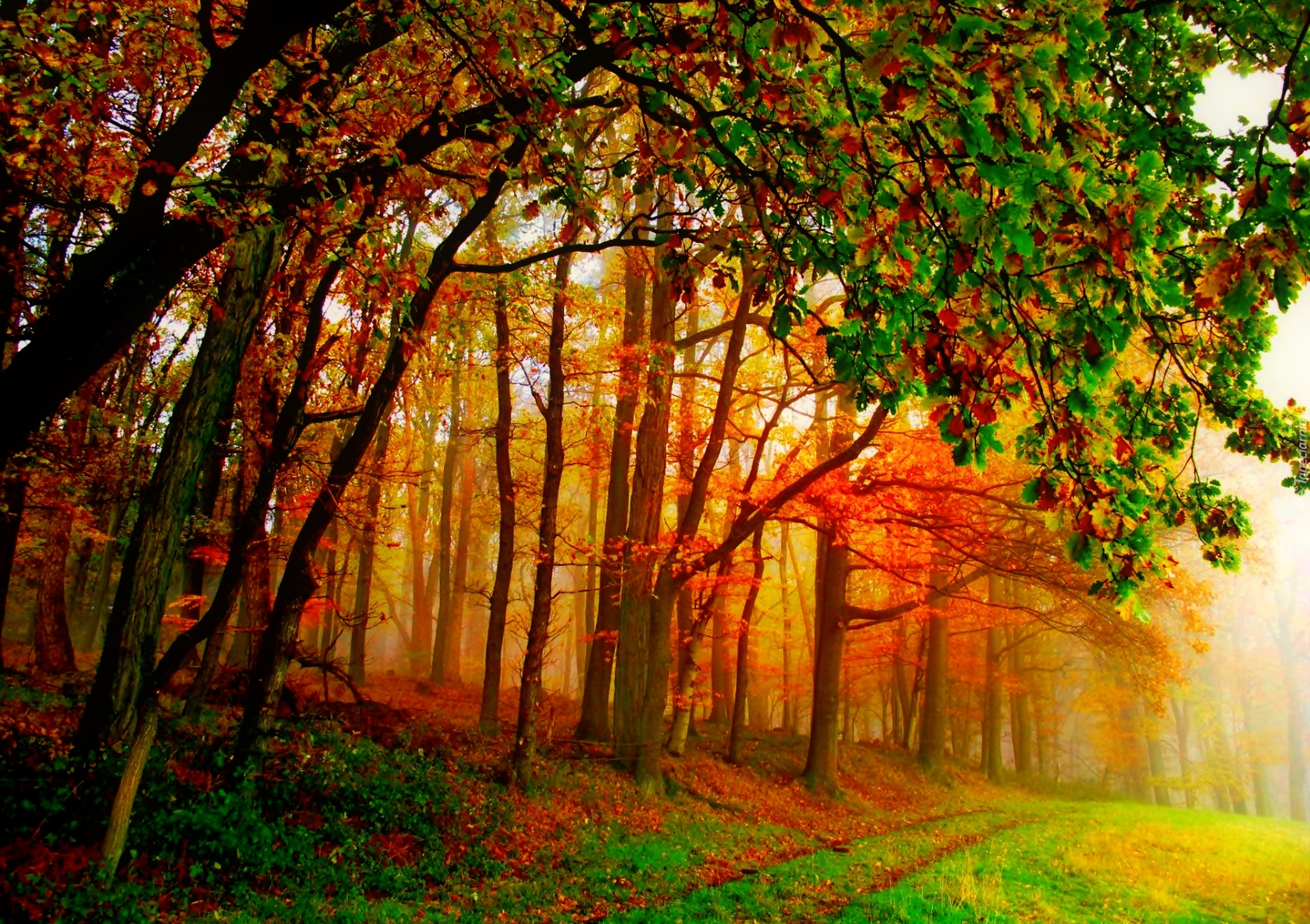 Edytor tapety: Las, Drzewa, Liście, Droga, Mgła, Złota, Jesień