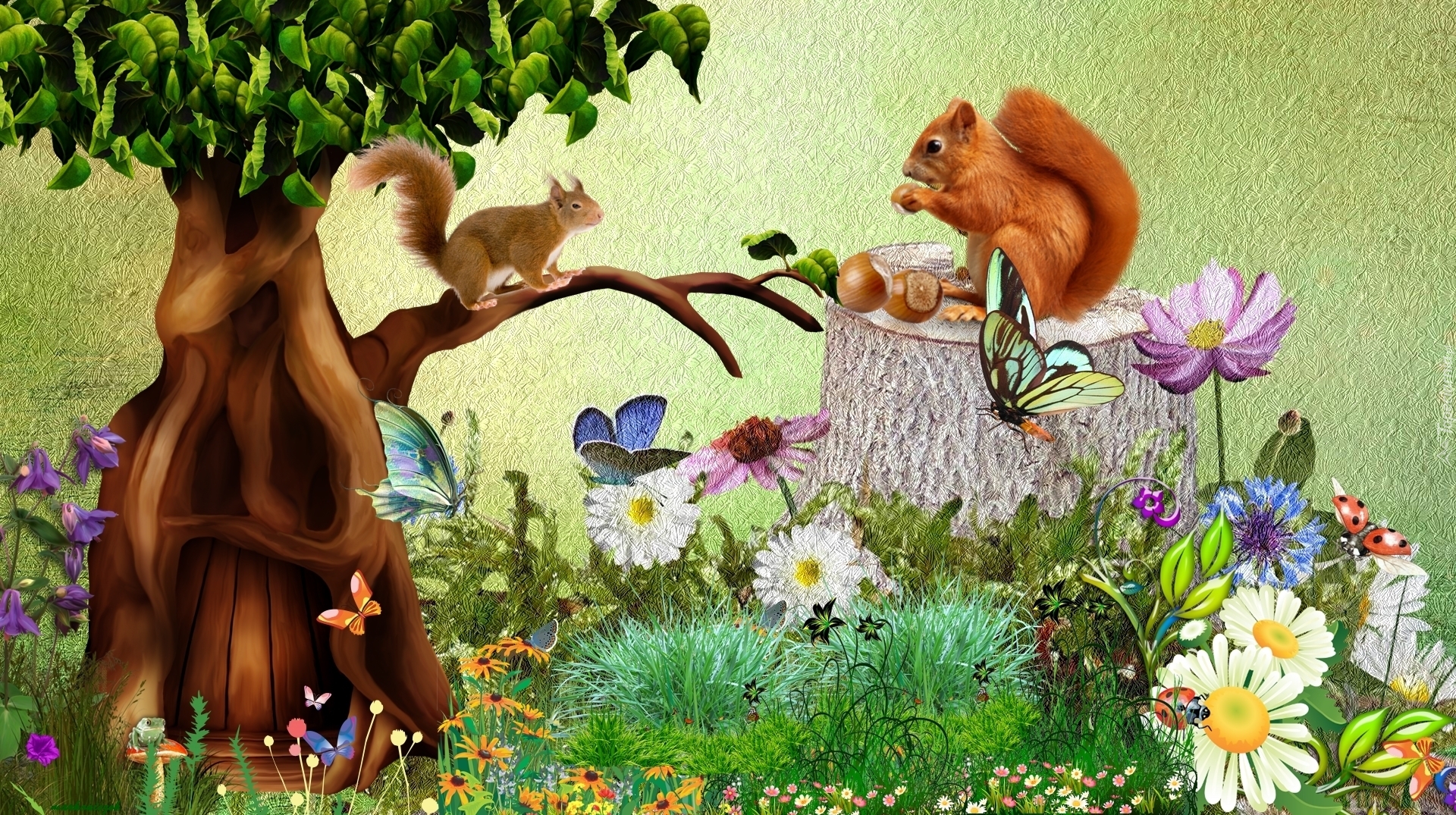 Edytor tapety: Grafika, 2D, Kwiaty, Wiewiórki, Drzewo