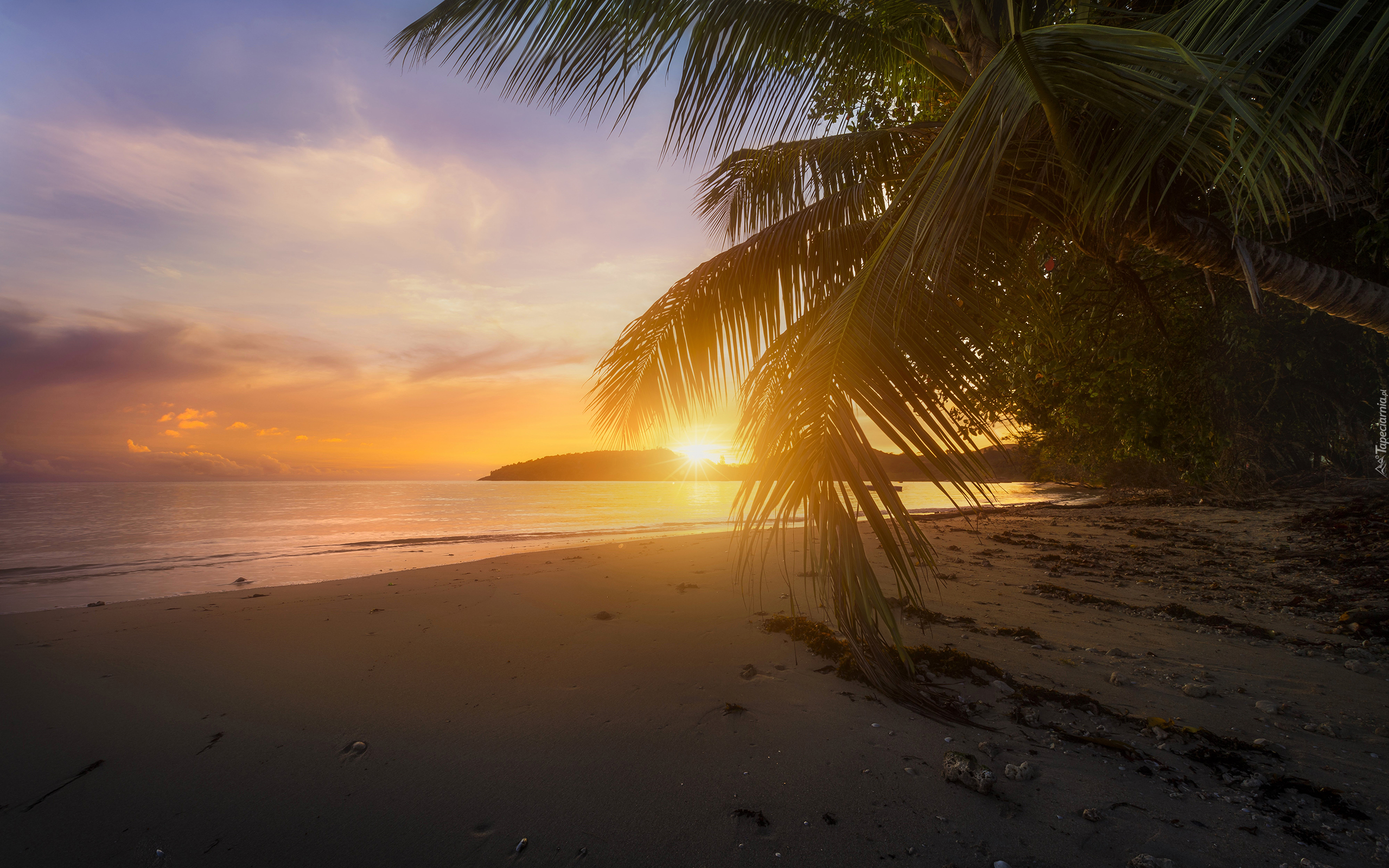 Edytor tapety: Morze, Palmy, Zachód słońca, Plaża