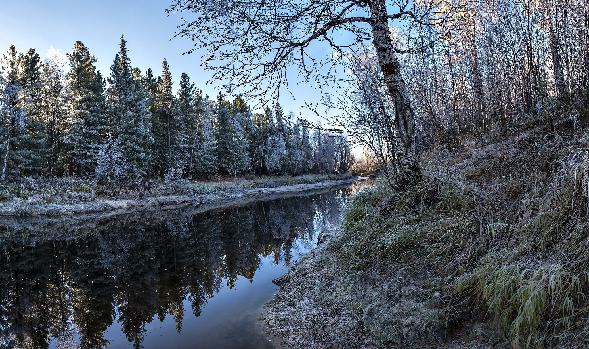 Edytor tapety: Zima, Rzeka, Drzewa, Odbicie