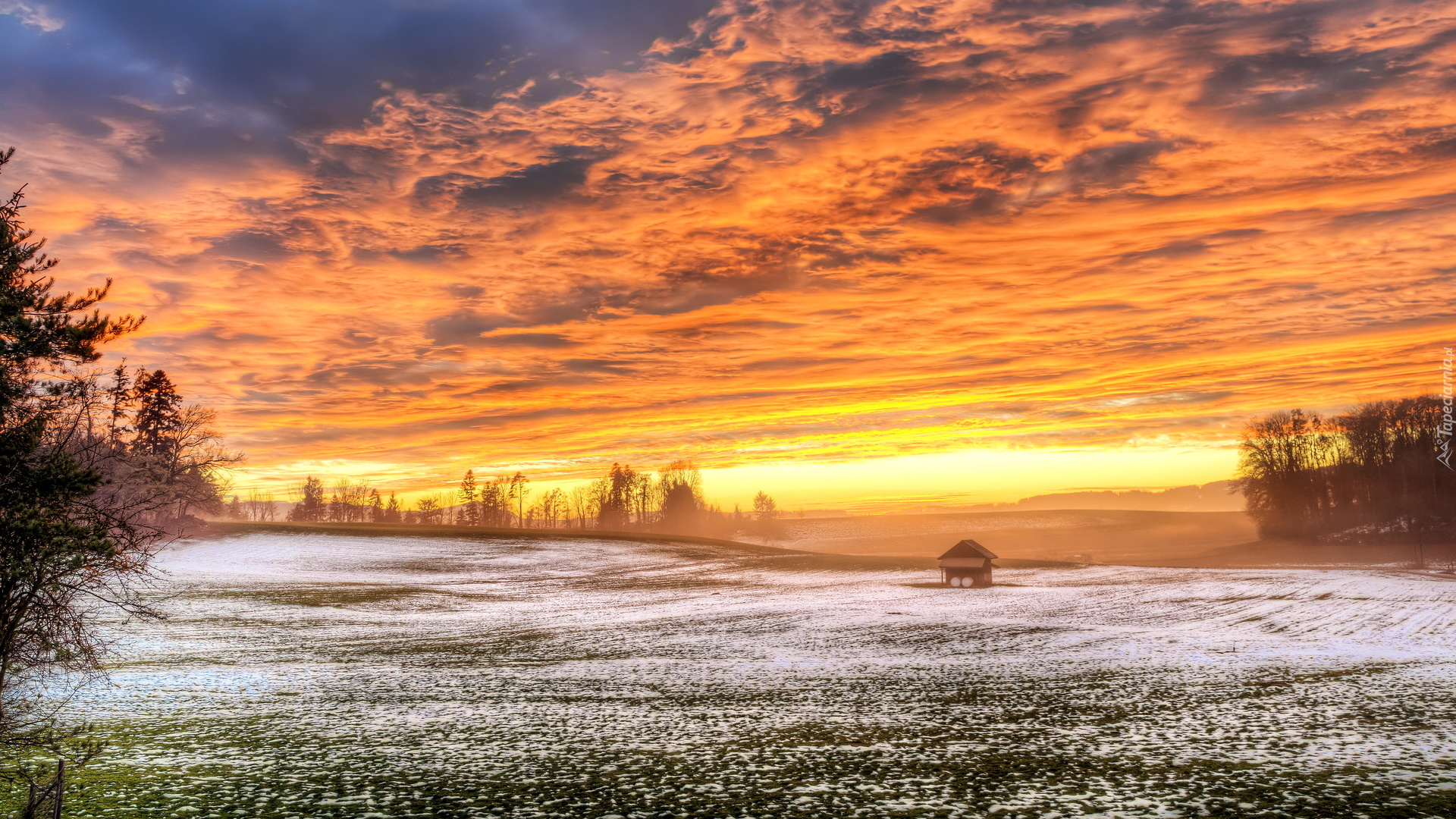 Edytor tapety: Pole, Zima, Zachód słońca, Drzewa, Niebo
