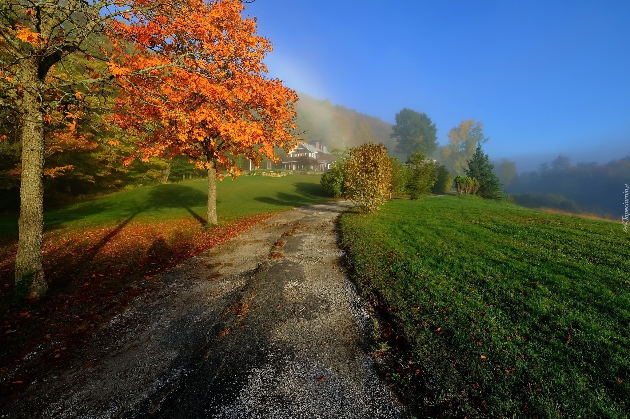 Edytor tapety: Droga, Jesień, Pola, Poranek, Mgła