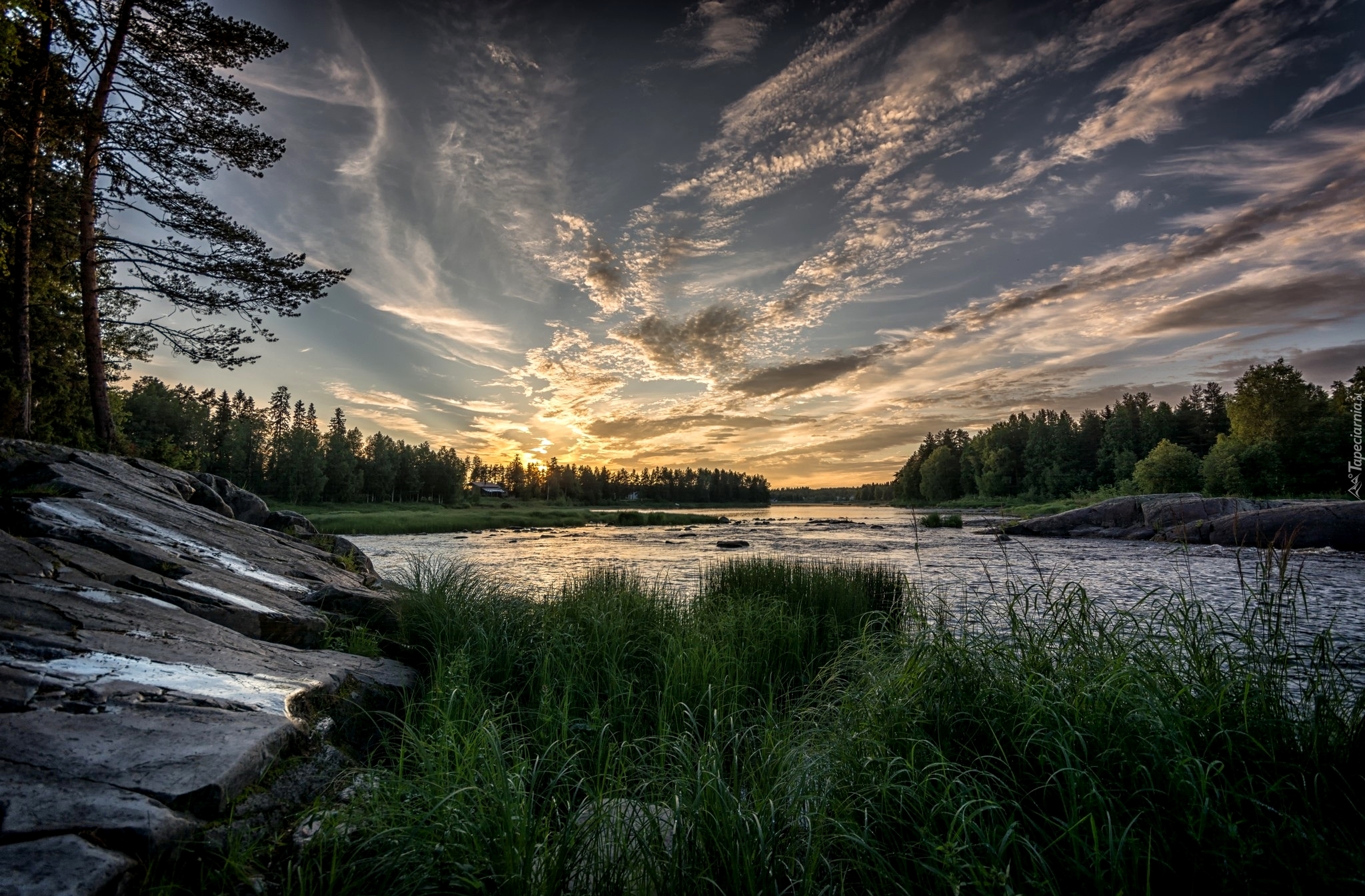 Edytor tapety: Jezioro, Skały, Drzewa, Zachód, Słońca, Roślinność