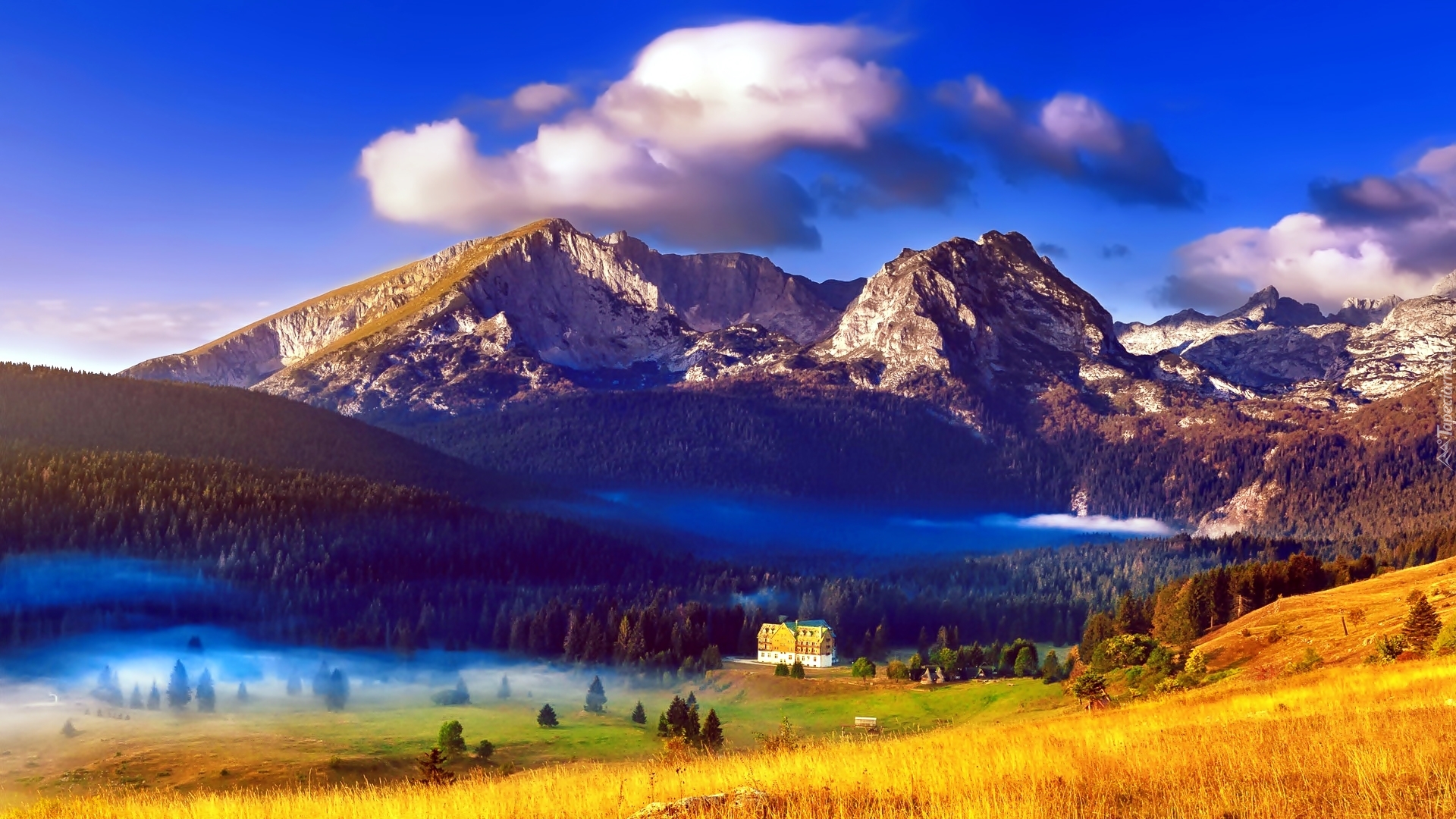Edytor tapety: Góry, Lasy, Wioska, Domy, Łąka, Mgła, Chmury, Jesień