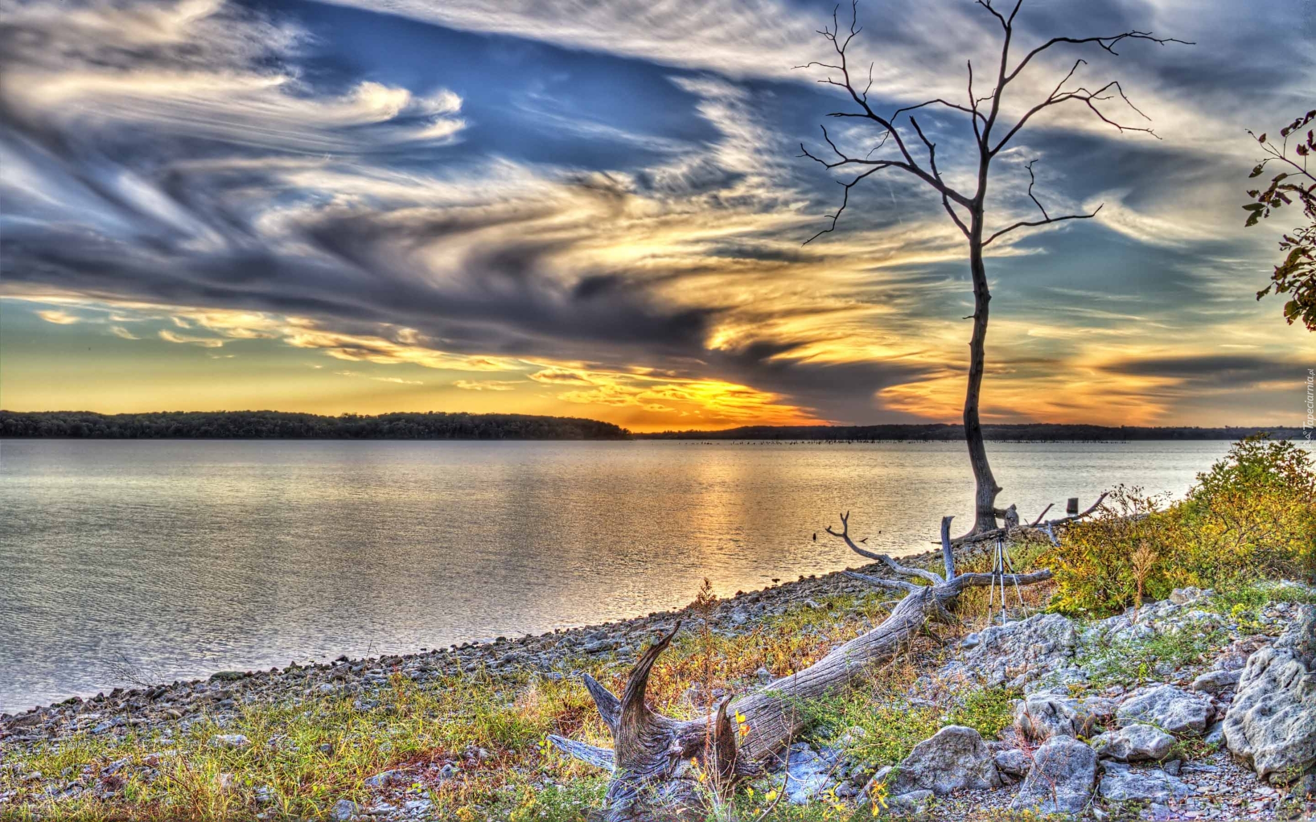 Edytor tapety: Jezioro, Kamienie, Niebo, Zachód słońca, Drzewa, Roślinność