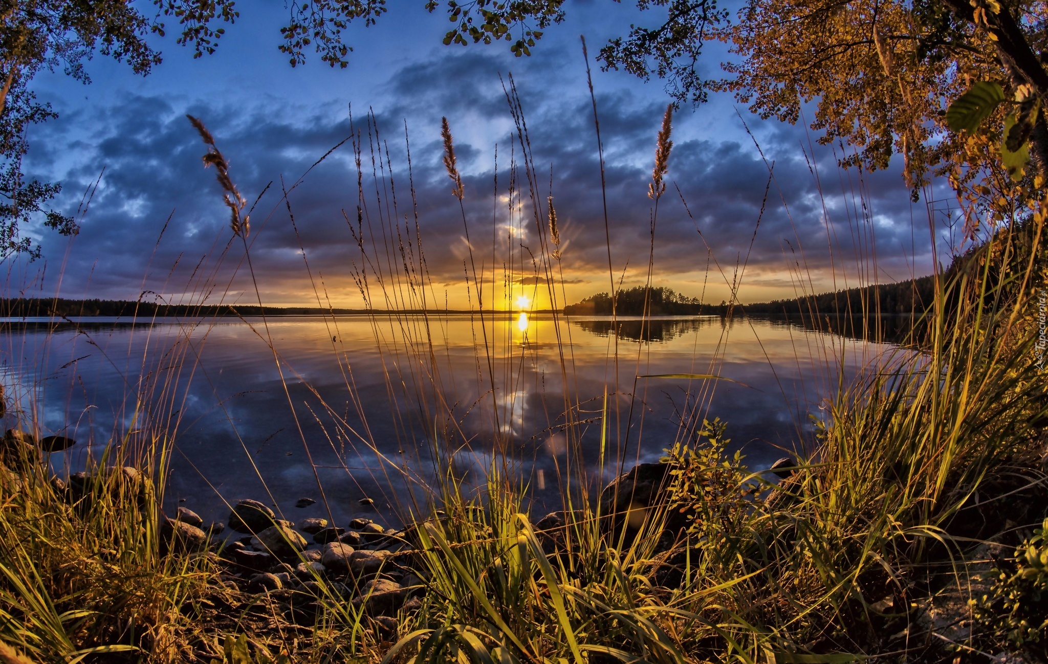 Edytor tapety: Jezioro, Szuwary, Zachód słońca