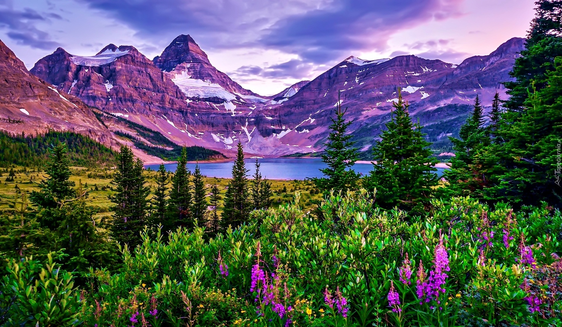 Edytor tapety: Góry, Jezioro, Drzewa, Kwiaty