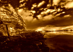Edytor tapety: Brzeg, Wrak, Statku Morze, Niebo, Miasto, Nocą