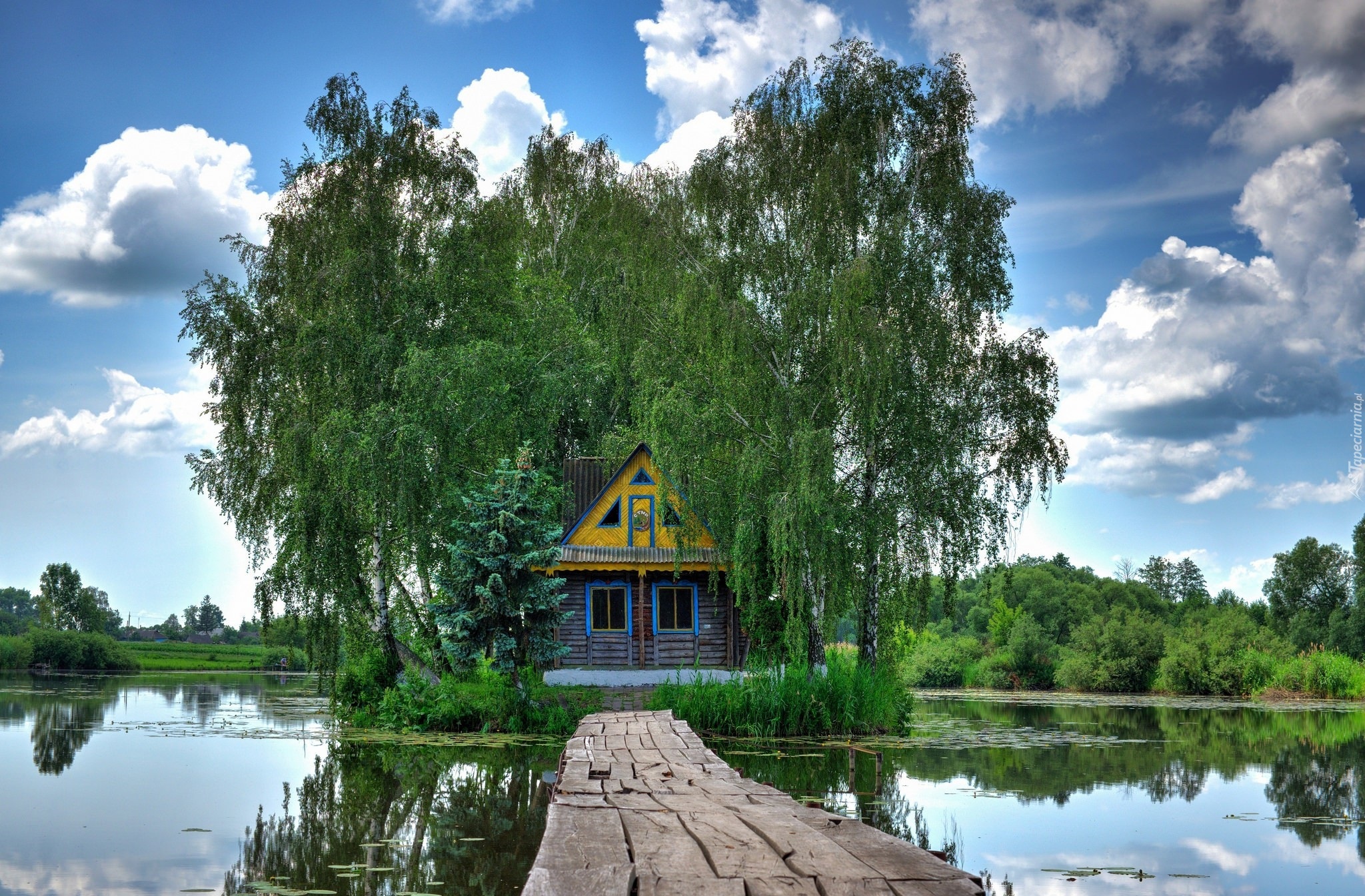 Edytor tapety: Jezioro, Drzewa, Dom, Pomost, Odbicie