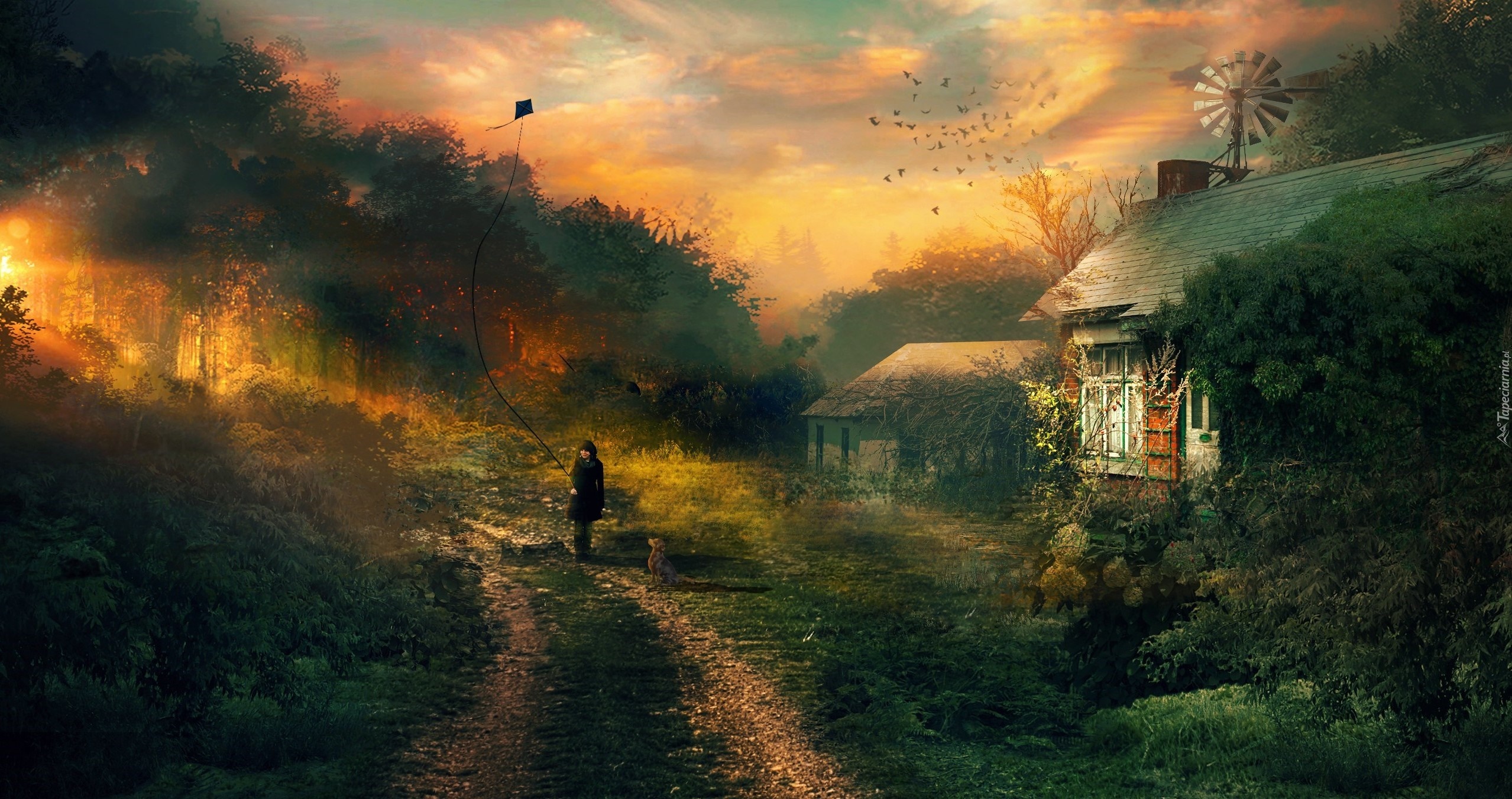 Edytor tapety: Droga, Dziewczynka, Pies, Dom, Drzewa, Grafika