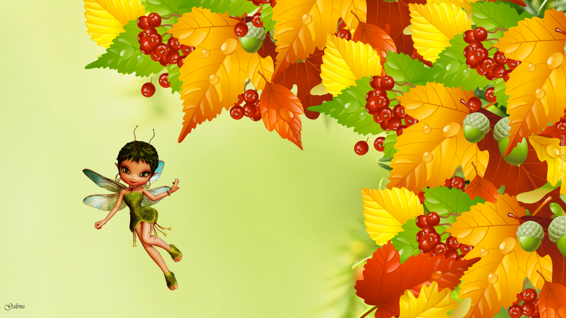 Edytor tapety: Liście, Żołędzie, Jarzębina, Jesień, Laleczka, Grafika