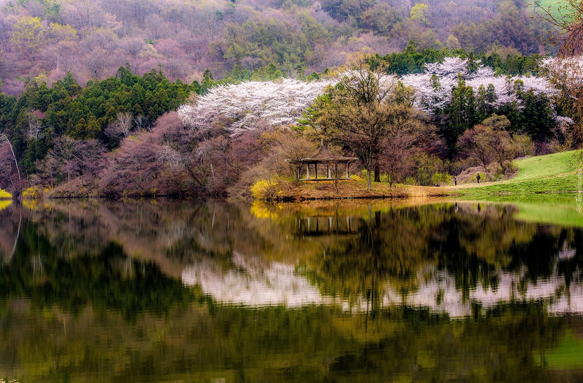 Edytor tapety: Rzeka, Drzewa, Altanka, Odbicie