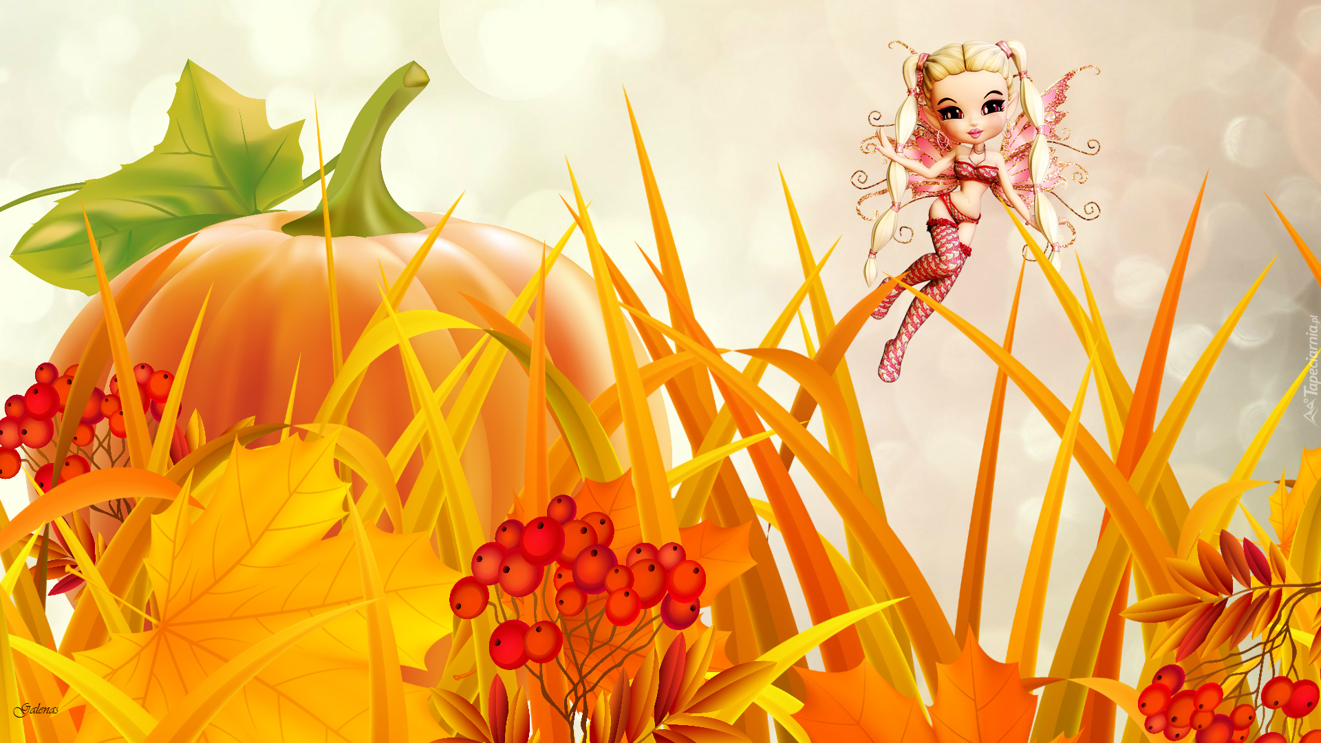 Edytor tapety: Dynia, Trawa, Jarzębina, Liście, Jesień, Laleczka, Grafika