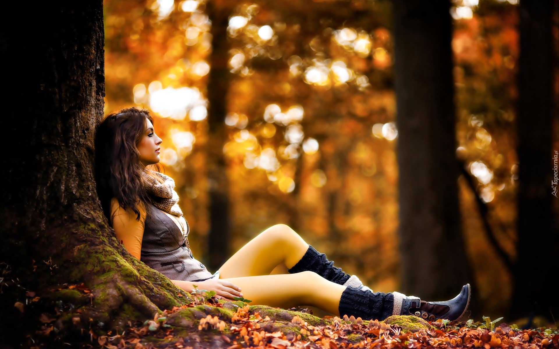 Edytor tapety: Dziewczyna, Drzewa, Liście, Las, Jesień
