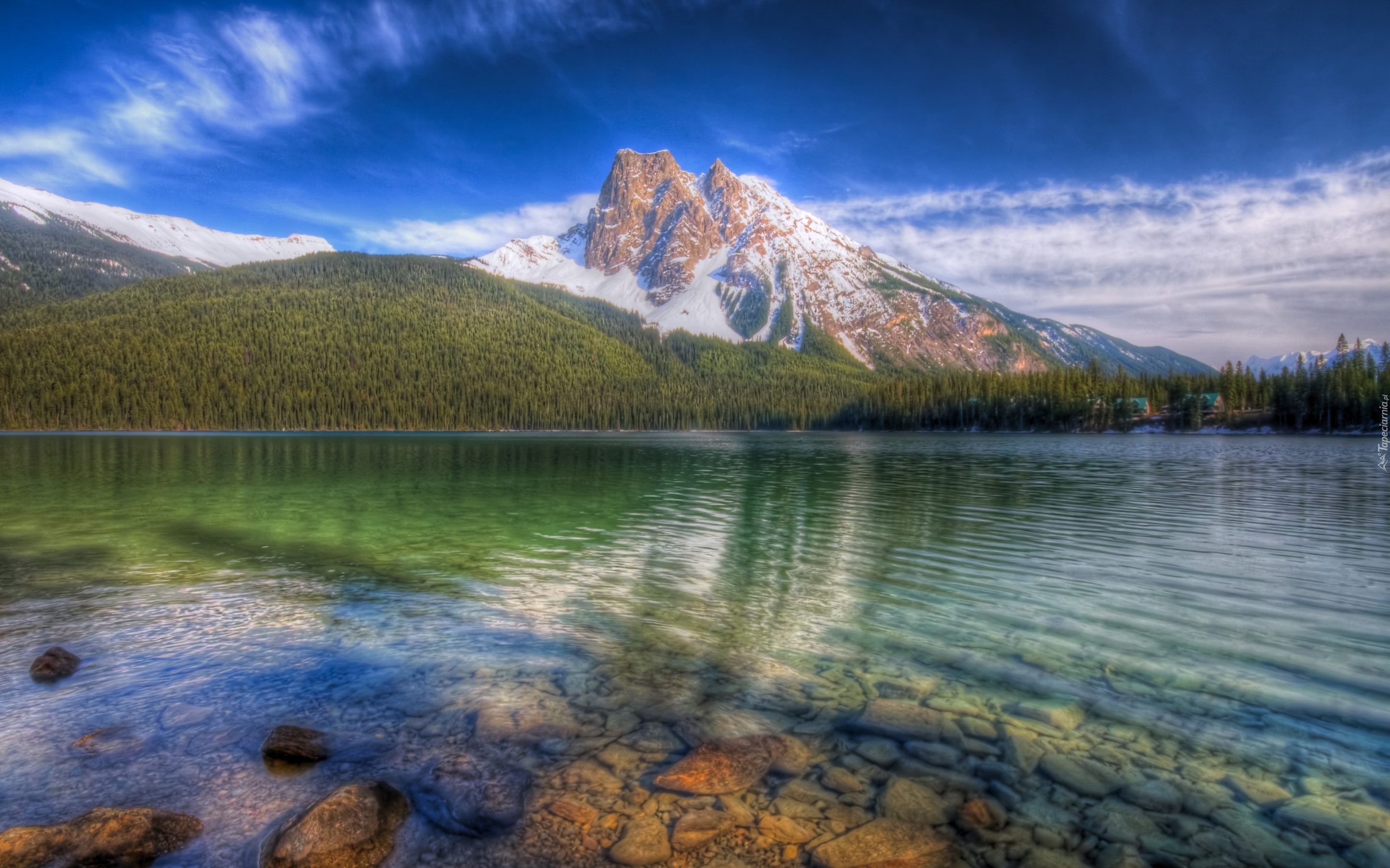 Edytor tapety: Góry, Jezioro, Ośnieżone szczyty, Las, Niebo, Kamienie