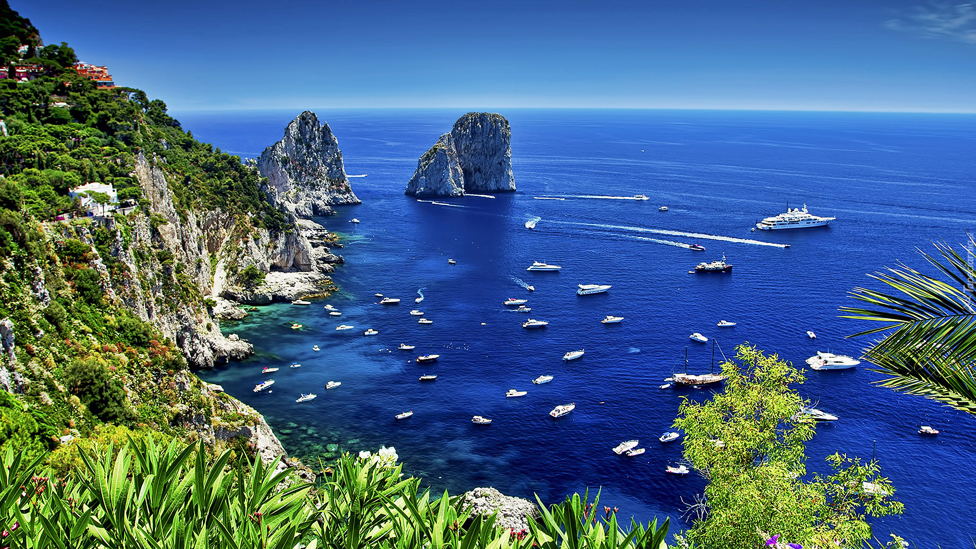 Edytor tapety: Europa, Włochy, Wyspa, Capri, Domki, Morze, Skały, Roślinność