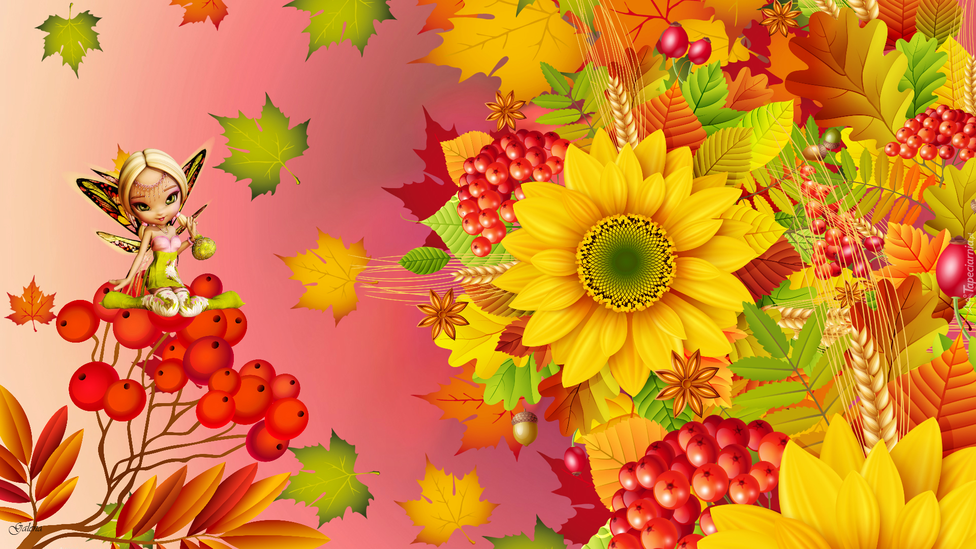 Edytor tapety: Liście, Słonecznik, Jarzębina, Laleczka, Jesień, Grafika