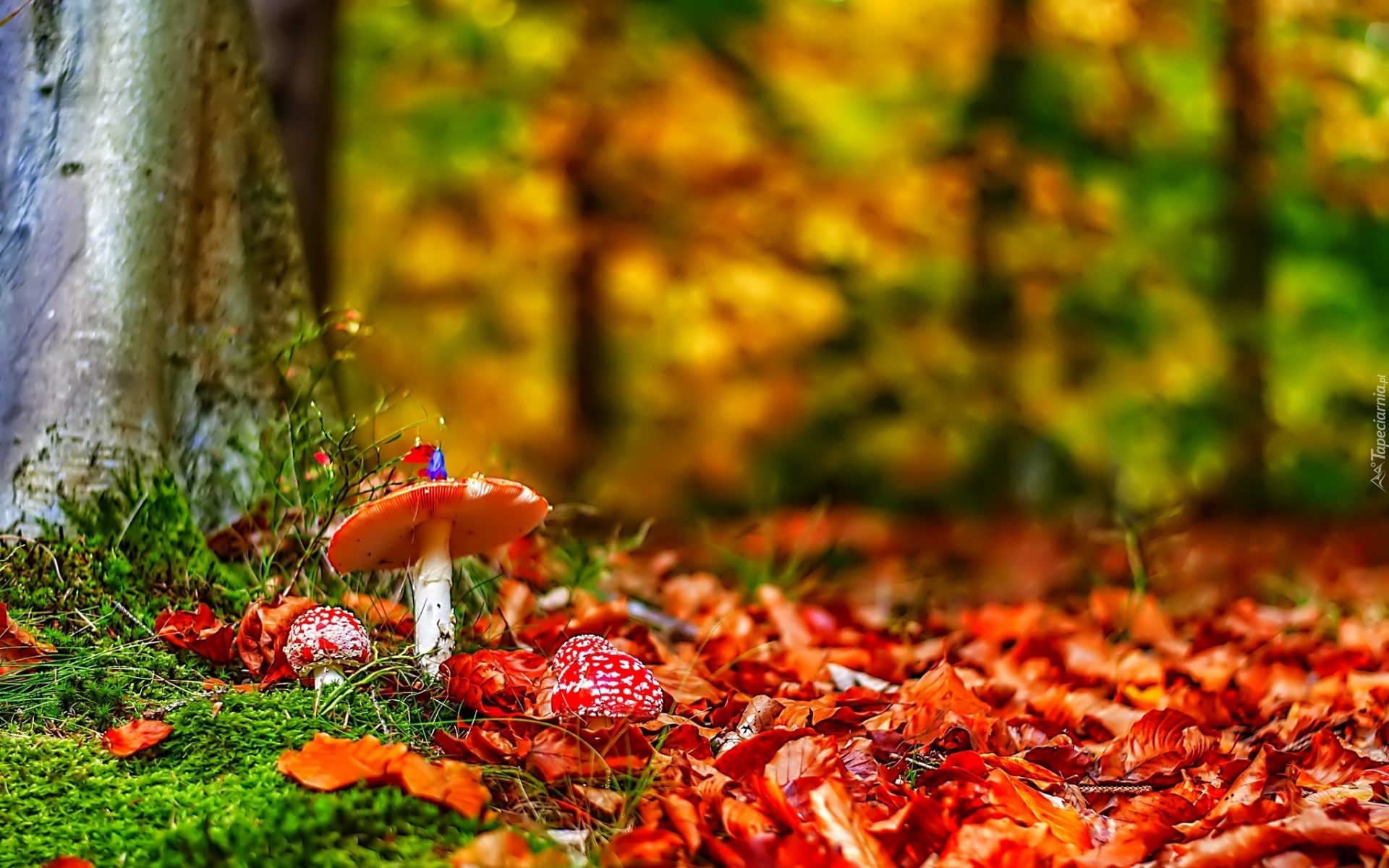 Edytor tapety: Jesień, Las, Drzewa, Liście, Grzyby, Muchomory