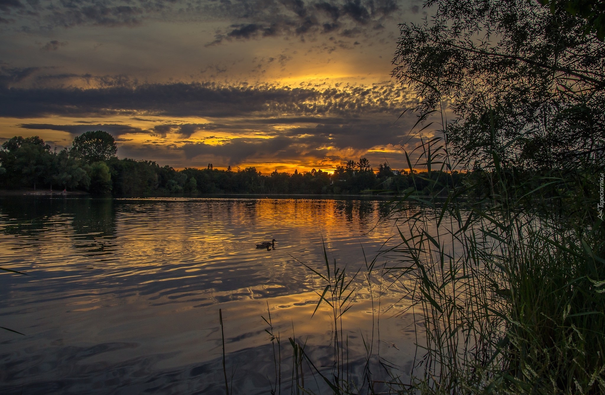 Edytor tapety: Rzeka, Drzewa, Zachód, Słońca, Kaczki