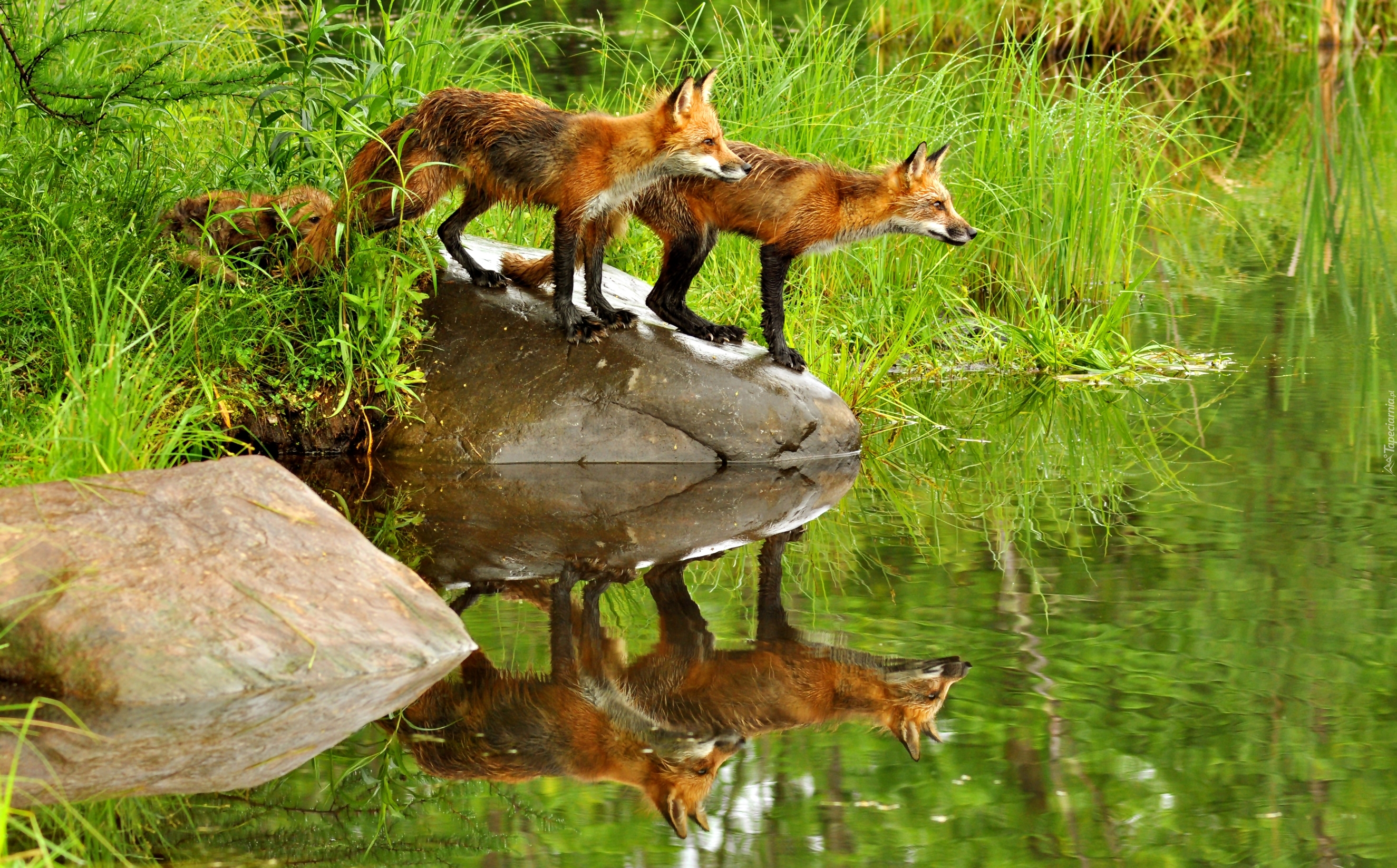Edytor tapety: Lisy, Jezioro, Staw, Woda, Trawa, Kamienie