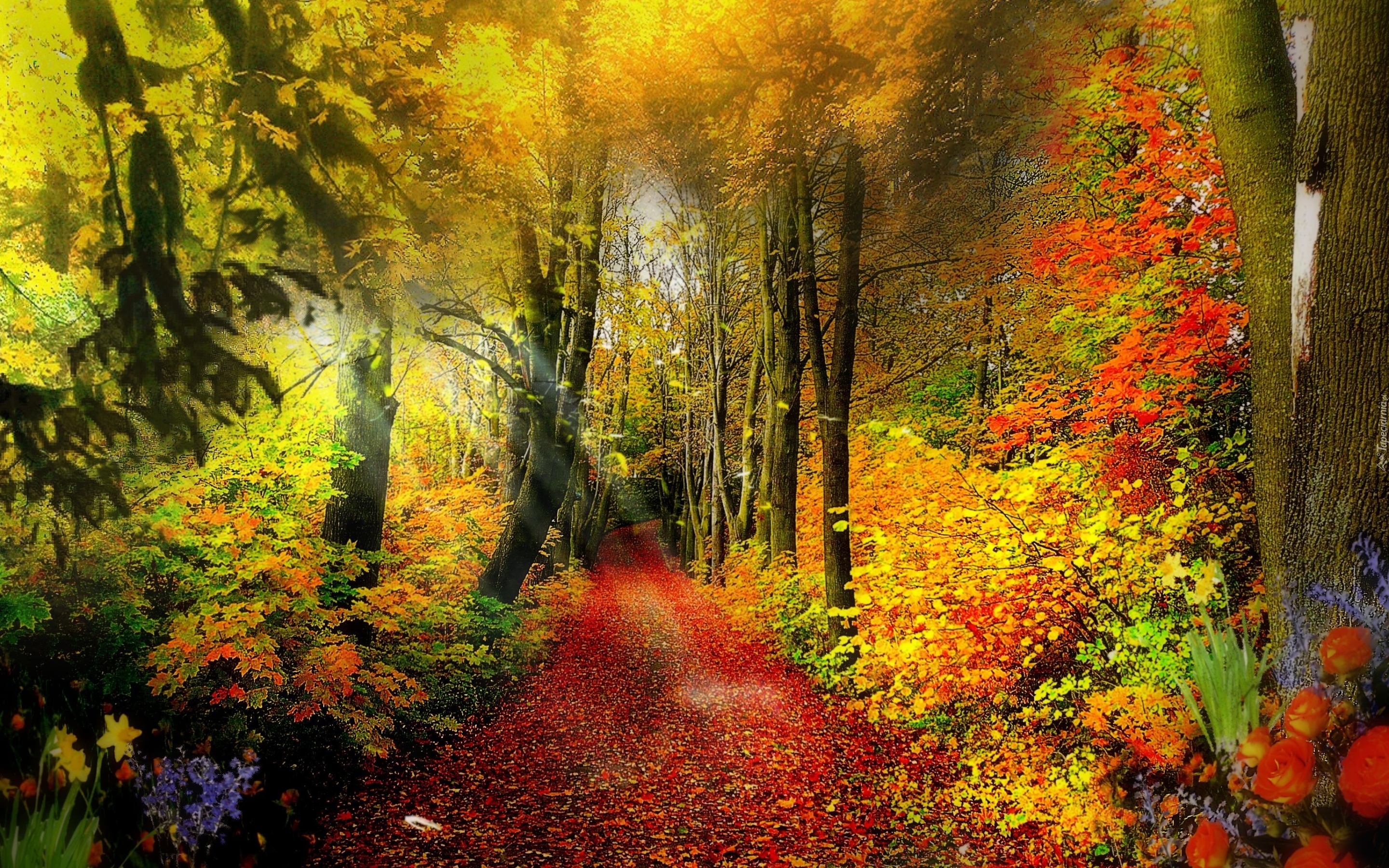 Edytor tapety: Jesień, Las, Ścieżka, Kwiaty, Liście