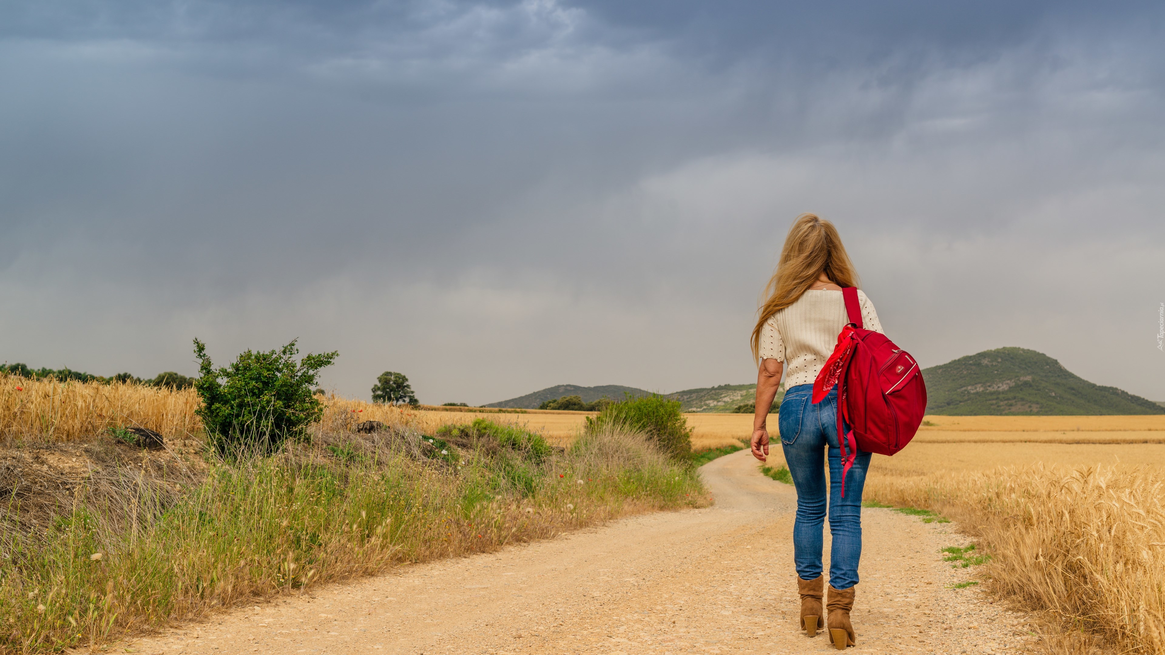 Edytor tapety: Droga, Dziewczyna, Plecak, Pola, Drzewa, Góry