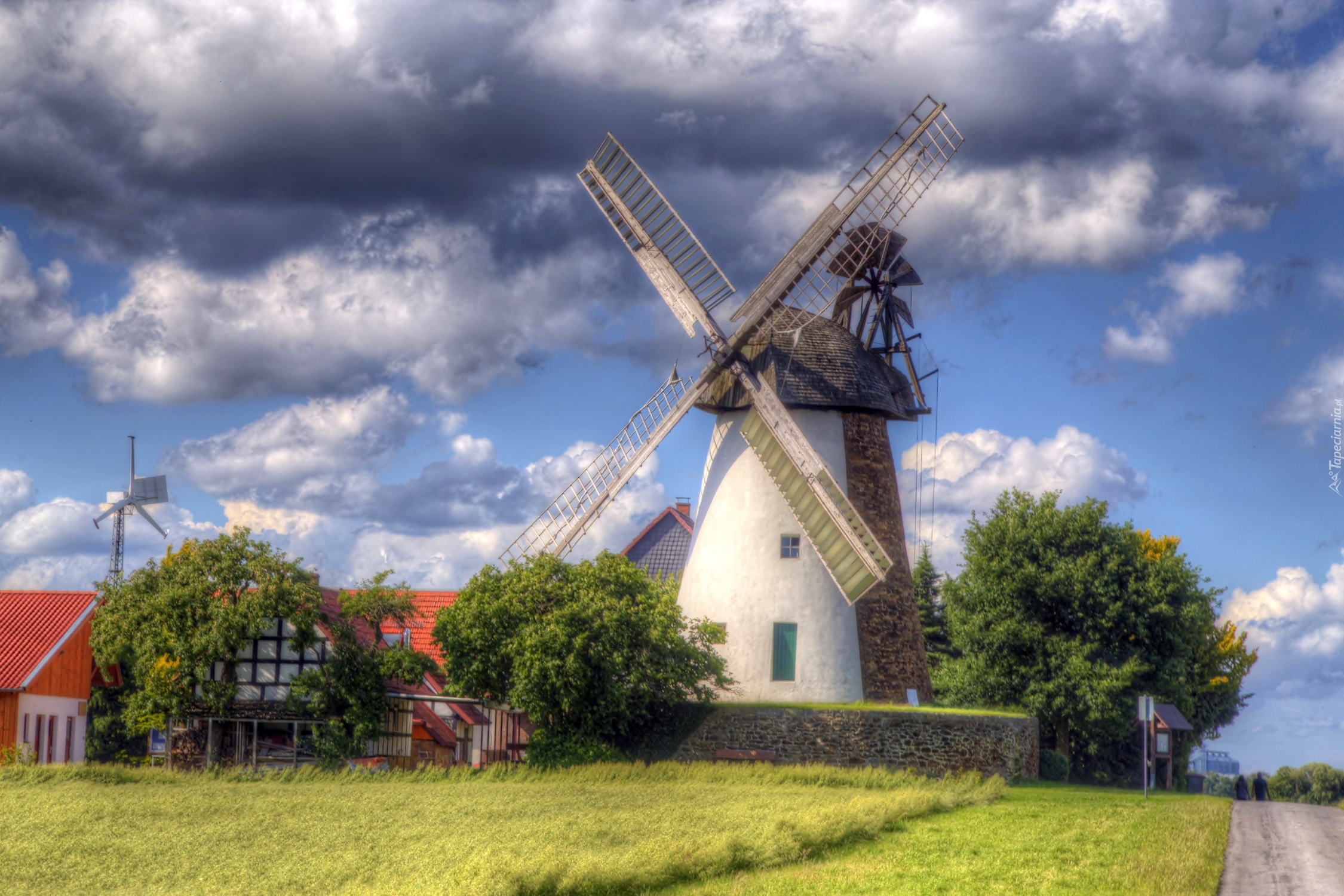 Edytor tapety: Wiatrak, Dom, Łąka, Chmury