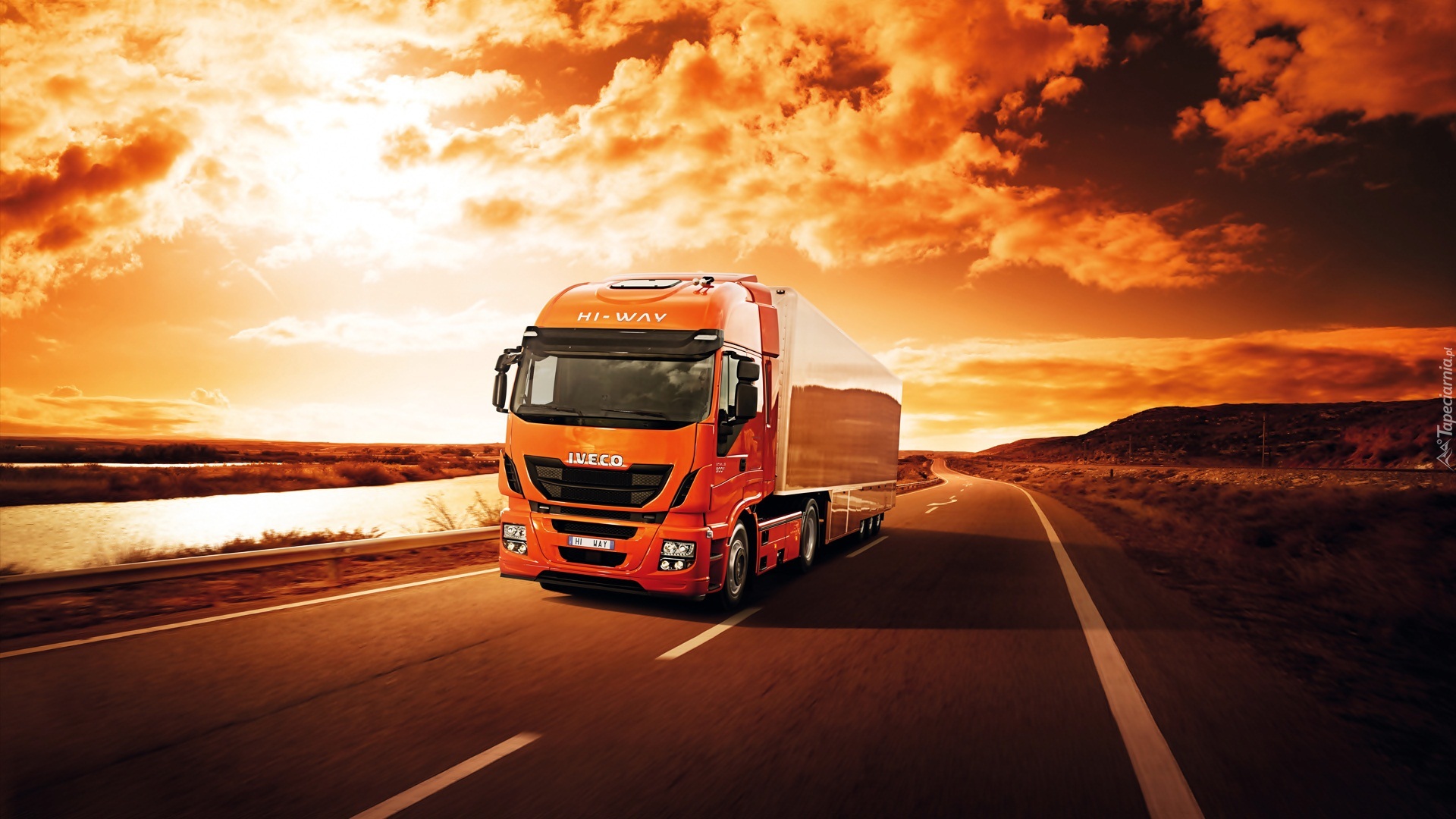 Edytor tapety: Ciężarówka, Droga, Zachód, Słońca