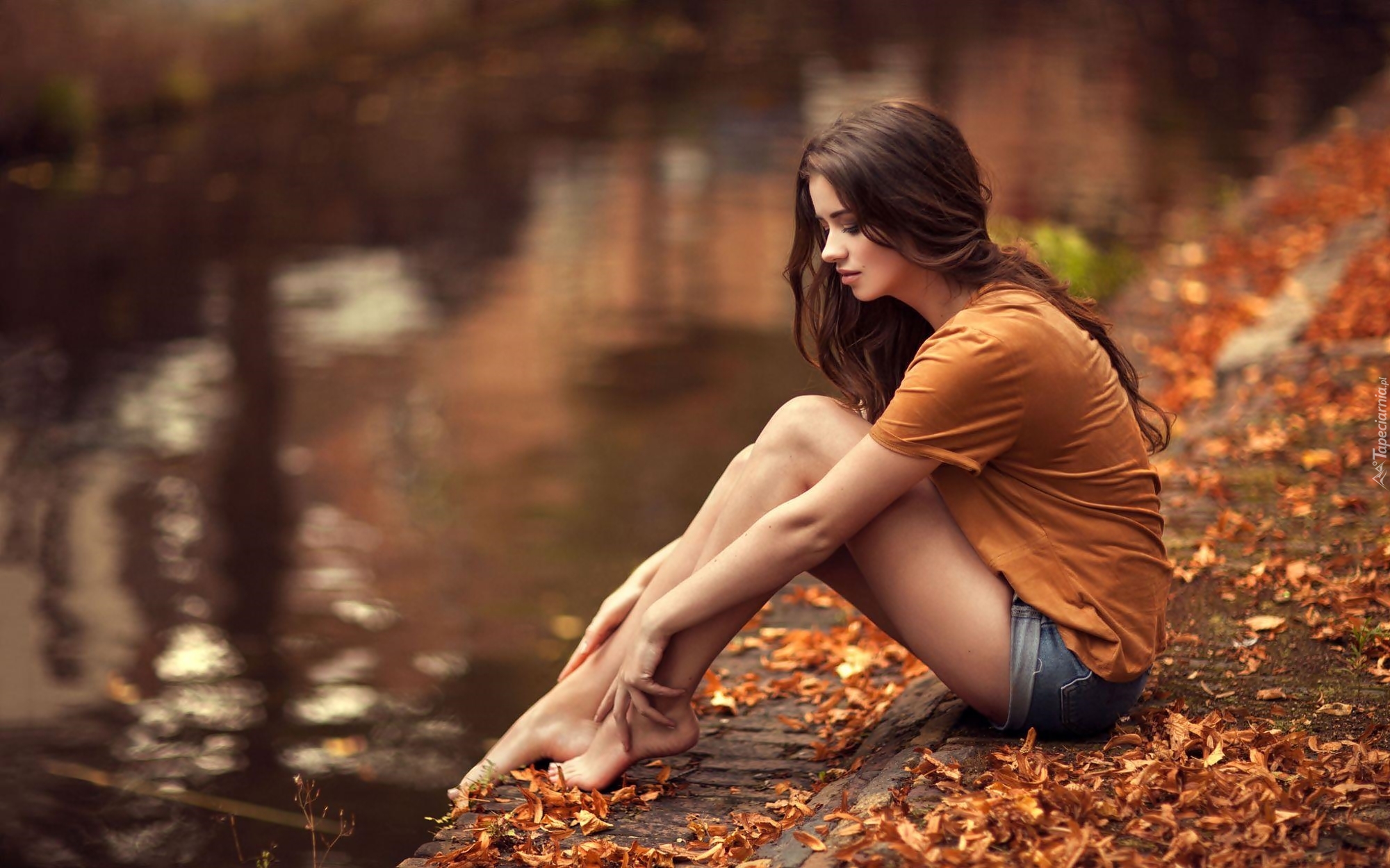 Edytor tapety: Kobieta, Brunetka, Rzeka, Kanał, Liście, Jesień