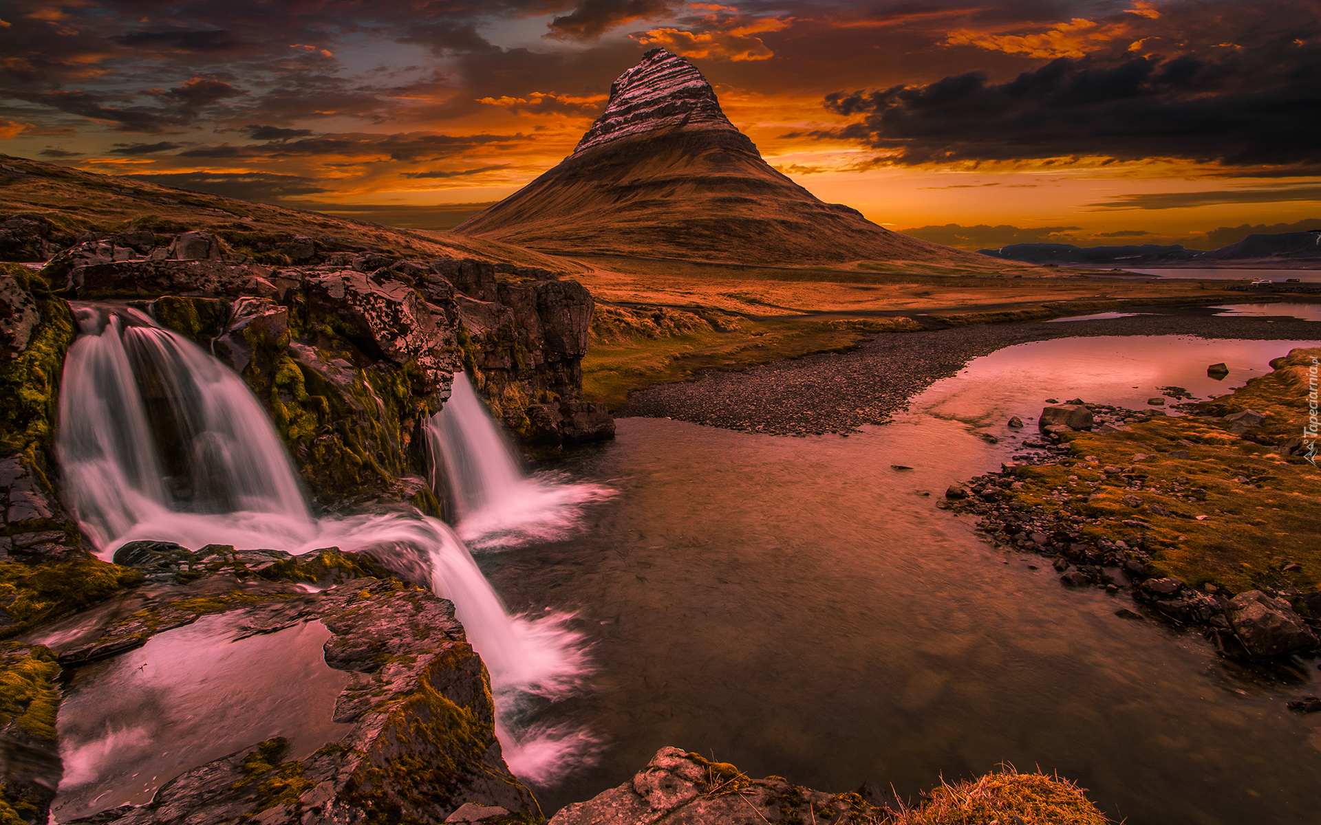 Edytor tapety: Islandia, Góra Kirkjufell, Wodospad, Zachód słońca