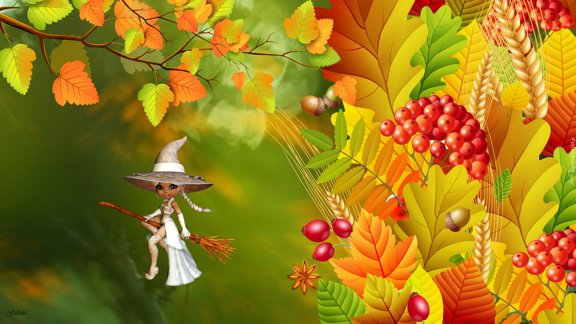 Edytor tapety: Jesień, Liście, Jarzębina, Wiedźma, Halloween, Grafika