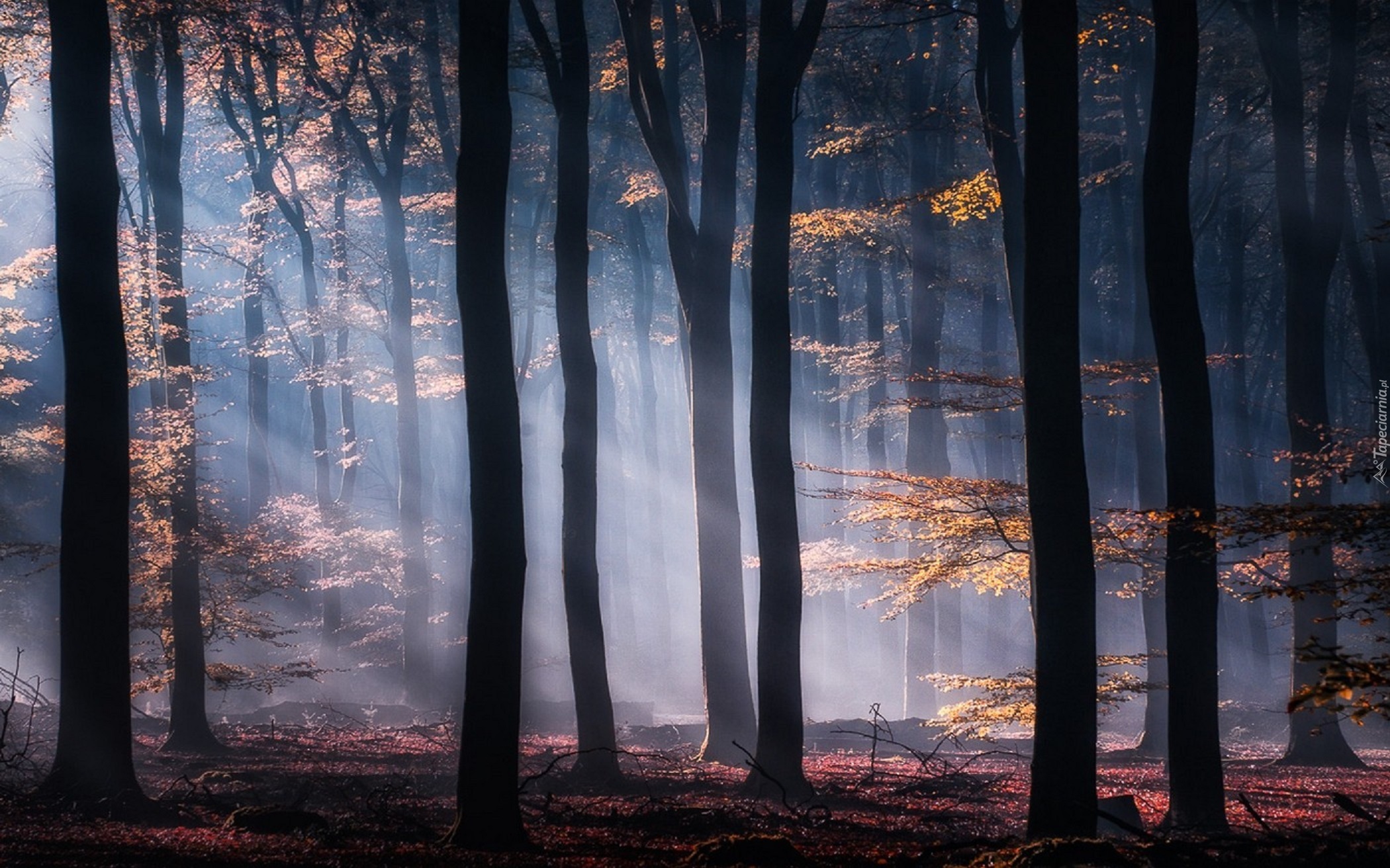 Edytor tapety: Jesień, Las, Drzewa, Promienie, Słońca