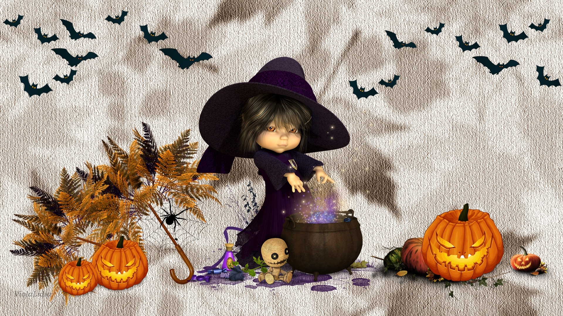 Edytor tapety: Grafika, Halloween, Nietoperze, Laleczka, Dynie