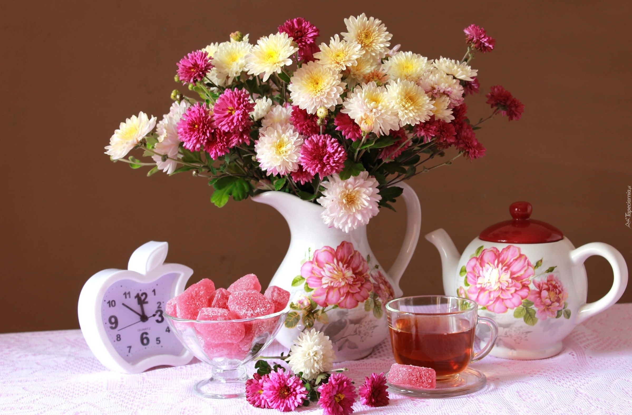 Edytor tapety: Bukiet, Chryzantem, Dzbanuszki, Herbata, Słodycze, Martwa, Natura