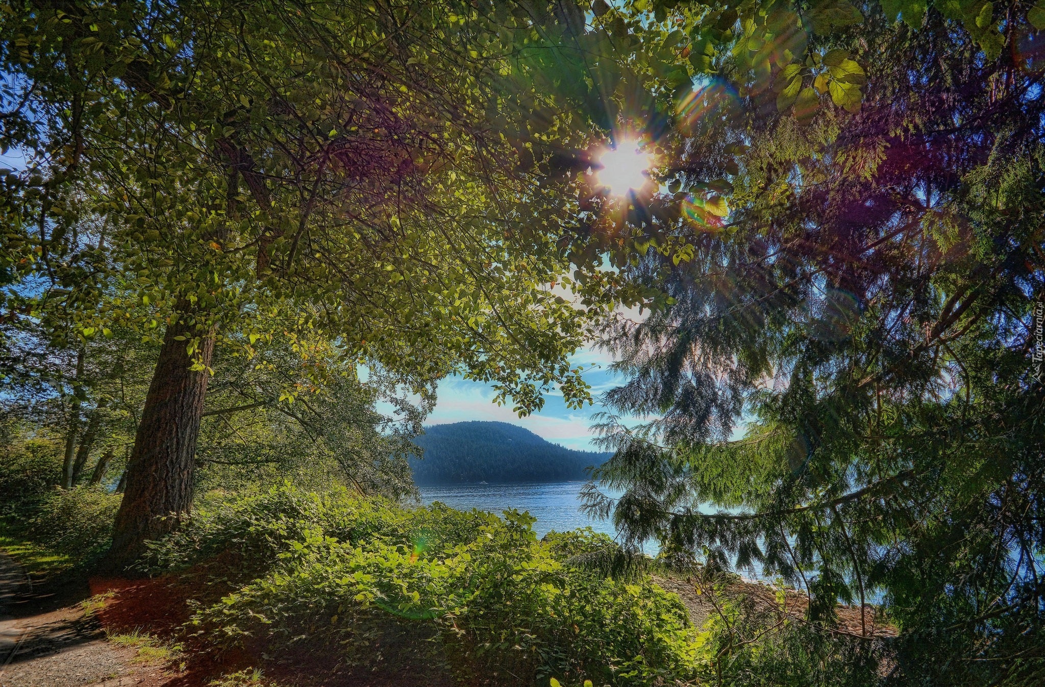 Edytor tapety: Jezioro, Drzewa, Promienie, Słońca