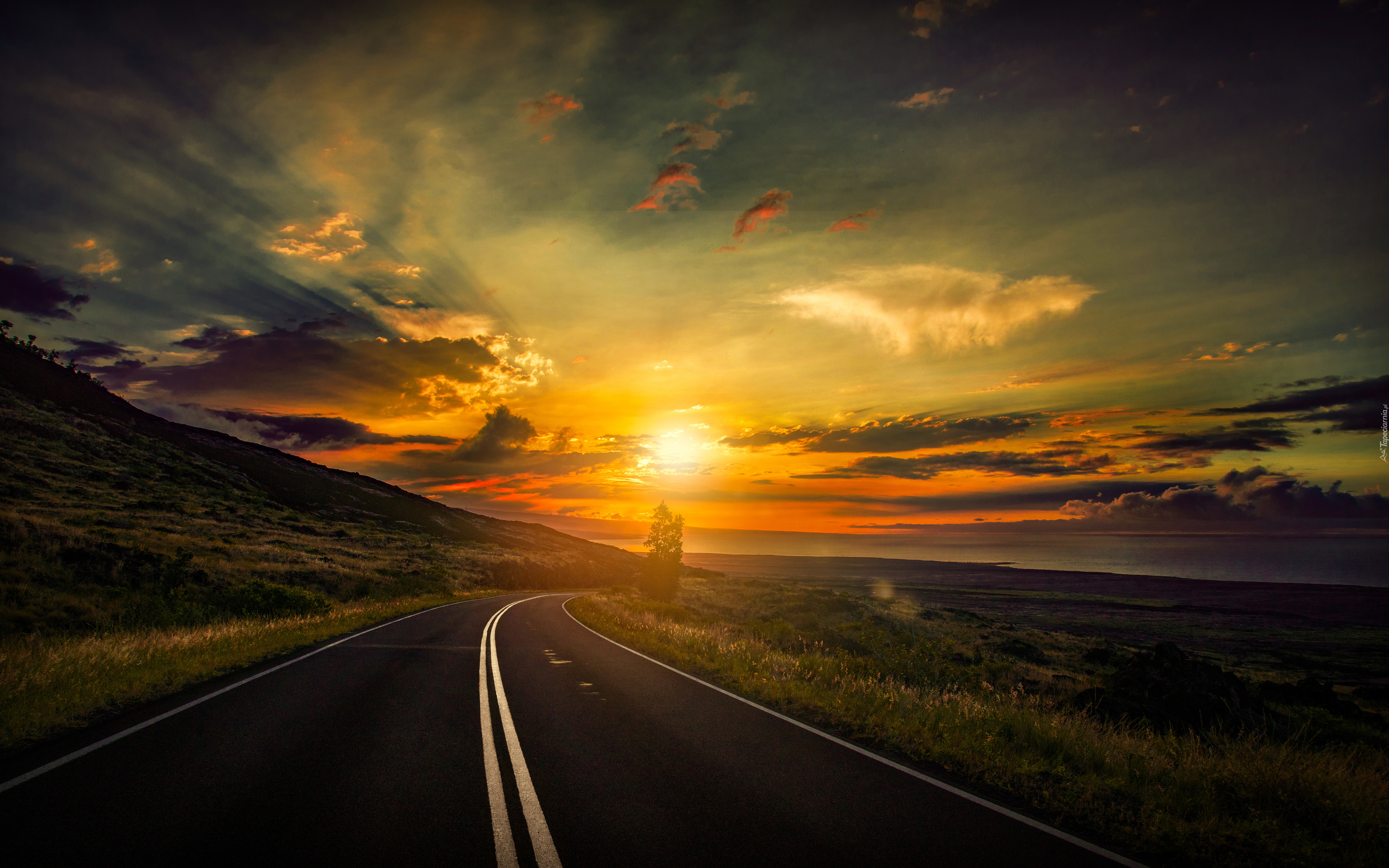 Edytor tapety: Wschód, Słońca, Droga, Drzewo, Góry
